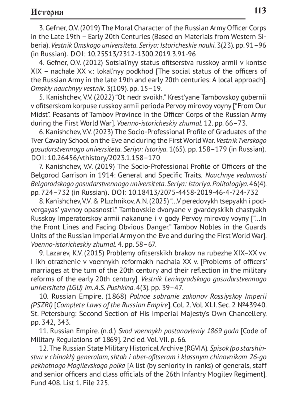 7. Канищев В.В. Социально-профессиональный облик офицеров Белгородского гарнизона в 1914 г.: общее и особенное // Научные ведомости Белгородского государственного университета. Серия: История. Политология. 2019. Т. 46, № 4. С. 724-732. DOI: 10.18413/2075-4458-2019-46-4-724-732 EDN: YYWTMS