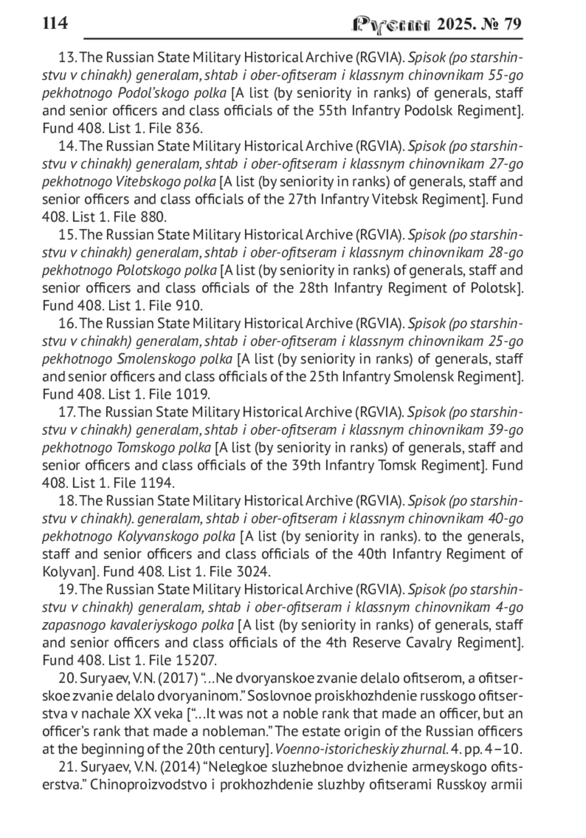 21. Суряев В.Н. “Нелёгкое служебное движение армейского офицерства”. Чинопроизводство и прохождение службы офицерами Русской армии накануне Первой мировой войны // Военно-исторический журнал. 2014. № 9. С. 50-57. EDN: SPWLKD