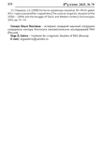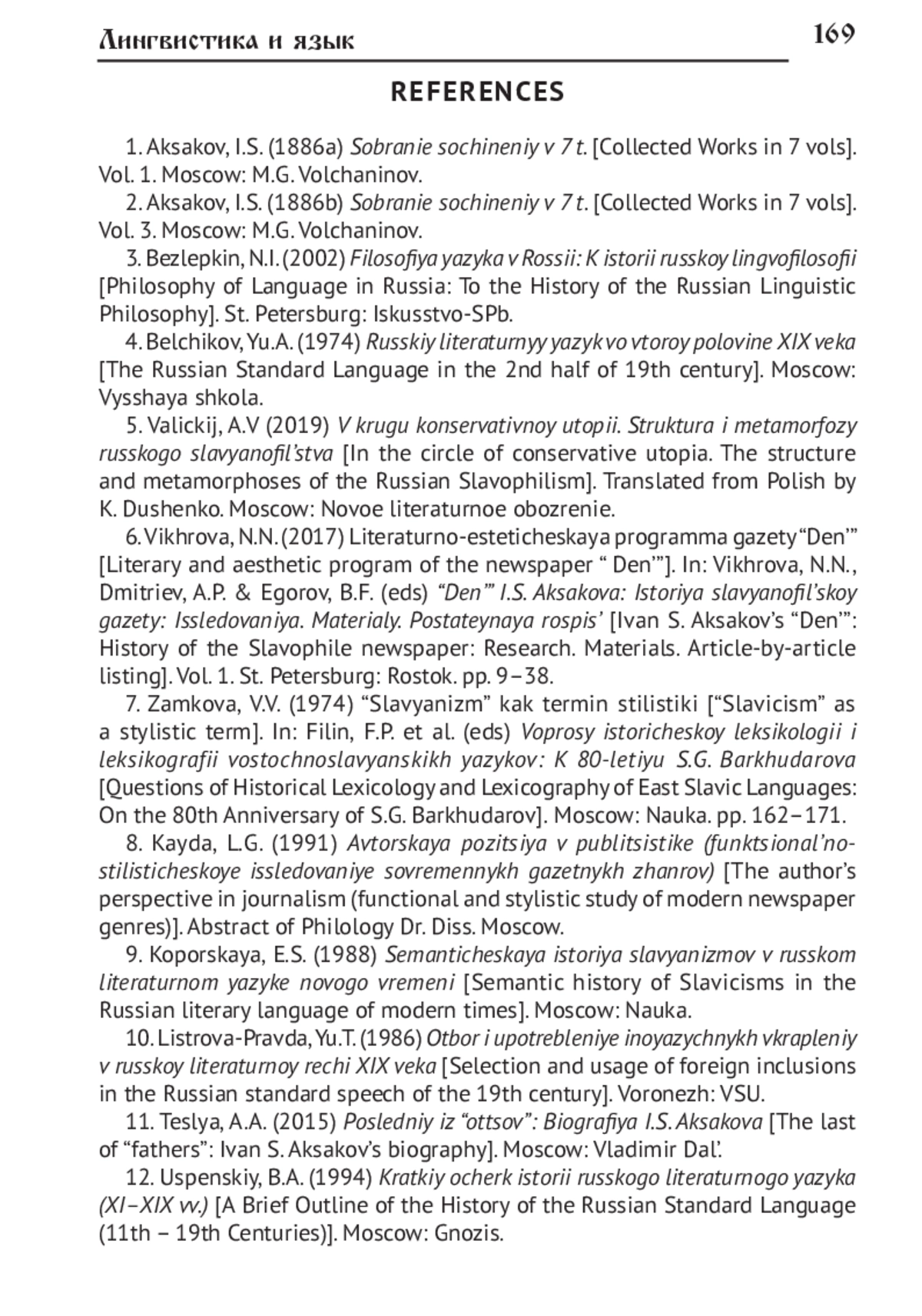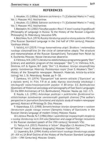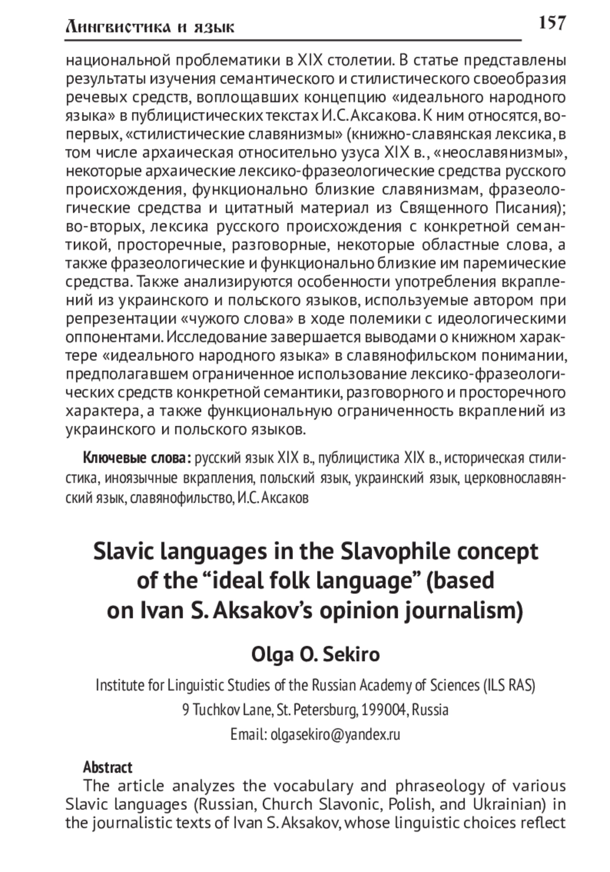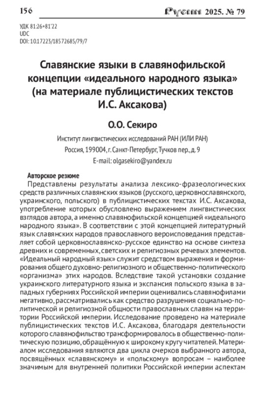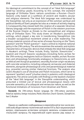 Представлены результаты анализа лексико-фразеологических средств различных славянских языков (русского, церковнославянского, украинского, польского) в публицистических текстах И. С. Аксакова, употребление которых обусловлено выражением лингвистических взглядов автора, а именно славянофильской концепцией «идеального народного языка». В соответствии с этой концепцией литературный язык славянских народов православного вероисповедания представляет собой церковнославянско-русское единство на основе синтеза древних и современных, светских и религиозных речевых элементов. «Идеальный народный язык» служит средством выражения и формирования общего духовно-религиозного и общественно-политического «организма» этих народов. Вследствие такой установки создание украинского литературного языка и экспансия польского языка в западных губерниях Российской империи оценивались славянофилами негативно, рассматривались как средство разрушения социально-политической и религиозной общности православных славян на территории Российской империи. Исследование проведено на материале публицистических текстов И. С. Аксакова, благодаря деятельности которого славянофильство трансформировалось в общественно-политическую позицию, обращённую к широкому кругу читателей. Материалом исследования являются два цикла очерков выбранного автора, посвящённых «славянскому» и «польскому» вопросам - наиболее значимым для внутренней политики Российской империи аспектам национальной проблематики в XIX столетии. В статье представлены результаты изучения семантического и стилистического своеобразия речевых средств, воплощавших концепцию «идеального народного языка» в публицистических текстах И. С. Аксакова. К ним относятся, во-первых, «стилистические славянизмы» (книжно-славянская лексика, в том числе архаическая относительно узуса XIX в., «неославянизмы», некоторые архаические лексико-фразеологические средства русского происхождения, функционально близкие славянизмам, фразеологические средства и цитатный материал из Священного Писания); во-вторых, лексика русского происхождения с конкретной семантикой, просторечные, разговорные, некоторые областные слова, а также фразеологические и функционально близкие им паремические средства. Также анализируются особенности употребления вкраплений из украинского и польского языков, используемые автором при репрезентации «чужого слова» в ходе полемики с идеологическими оппонентами. Исследование завершается выводами о книжном характере «идеального народного языка» в славянофильском понимании, предполагавшем ограниченное использование лексико-фразеологических средств конкретной семантики, разговорного и просторечного характера, а также функциональную ограниченность вкраплений из украинского и польского языков.