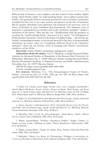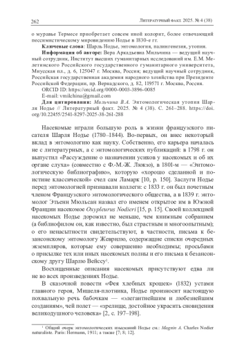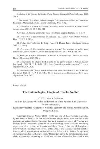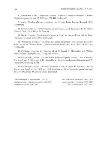 8. Montandon A. Nodier et l’insecte // Cahiers d’études nodiéristes. Charles Nodier comparatiste. 2023. № 12. P. 129-141.