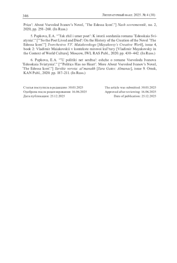 5. Папкова Е.А. “Так жил и умер поэт”: К истории создания романа Всеволода Иванова “Эдесская святыня” // Творчество В.В. Маяковского. М.: ИМЛИ РАН, 2020. Вып. 4. Кн. 2: Владимир Маяковский в контексте мировой культуры. С. 430-442. EDN: FAXCRG