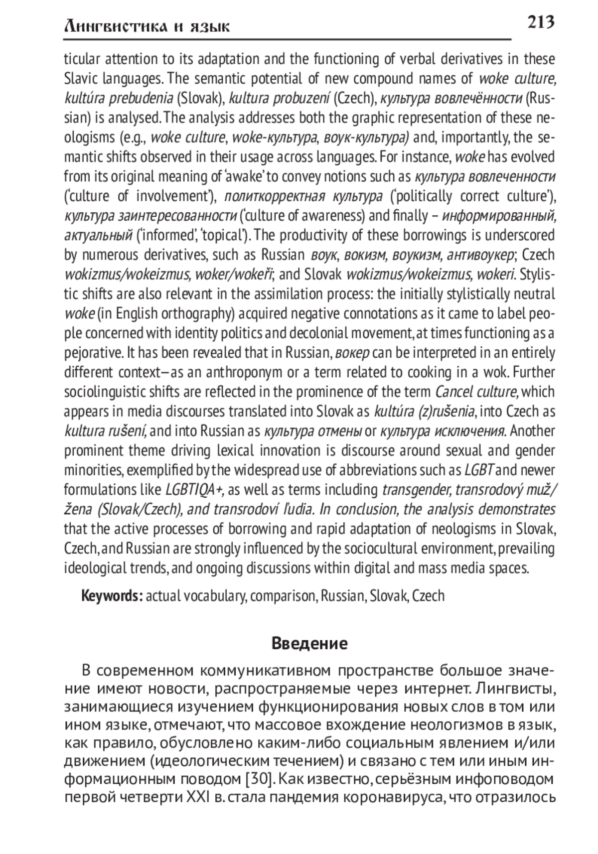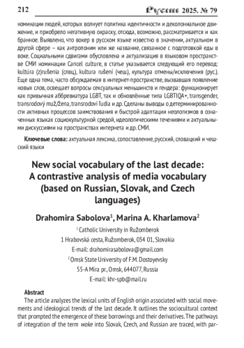 Анализируются лексические единицы англоязычного происхождения, связанные с социальными движениями и идеологическими течениями последнего десятилетия. Кратко представлена социокультурная ситуация, вызвавшая появление англоязычных заимствований и их производных. Прослеживаются пути вхождения глагола woke в словацкий, чешский и русский языки, адаптация заимствования и функционирование отглагольных дериватов в названных славянских языках. Анализируется семантический потенциал новых составных наименований woke culture, kultúra prebudenia (слвц.), kultura probuzení (чеш.), культура вовлечённости (рус.). При анализе неологизмов обращается внимание как на их графическое оформление (woke culture, woke-культура, воук-культура и т. п.), так и (что очень важно) на семантические сдвиги при их функционировании в том или ином языке: так, woke - от первоначального значения ‘проснуться, очнуться’ до ‘культура вовлечённости’, ‘политкорректная культура’ (рус.), ‘культура заинтересованности’ и, наконец, ‘информированный’, ‘актуальный’. Многочисленные дериваты (воук, вокизм, воукизм, антивоукер - рус.; wokizmus/ wokeizmus, woker/wokeři - чеш.; wokizmus/ wokeizmus, wokeri - слвц.) подчеркивают актуальность неологизмов. Стилистические сдвиги также оказываются релевантны при усвоении анализируемых заимствований: первоначально стилистически нейтральное woke (в английской графике) стало употребляться для номинации людей, которых волнует политика идентичности и деколониальное движение, и приобрело негативную окраску, отсюда, возможно, рассматривается и как бранное. Выявлено, что вокер в русском языке известно в значении, актуальном в другой сфере - как антропоним или же название, связанное с подготовкой еды в воке. Социальными сдвигами обусловлена и актуализация в языковом пространстве СМИ номинации Cancel culture, в статье указывается следующий его перевод: kultúra (z)rušenia (слвц.), kultura rušení (чеш.), культура отмены/исключения (рус.). Еще одна тема, часто обсуждаемая в интернет-пространстве, вызвавшая появление новых слов, освещает вопросы сексуальных меньшинств и гендера: функционирует как привычная аббревиатура LGBT, так и обновлённые типа LGBTIQA+, transgender, transrodový muž/žena, transrodoví ľudia и др. Сделаны выводы о детерминированности активных процессов заимствования и быстрой адаптации неологизмов в означенных языках социокультурной средой, идеологическими течениями и актуальными дискуссиями на пространствах интернета и др. СМИ.