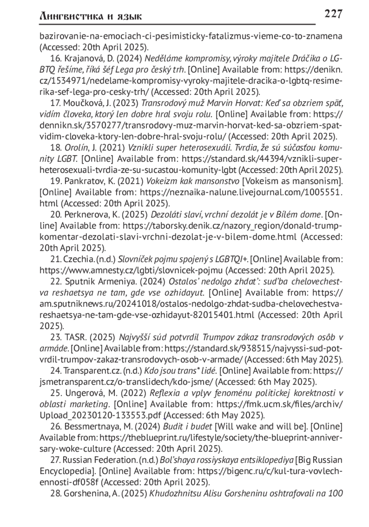 17. Moučková J. Transrodový muž Marvin Horvat: Keď sa obzriem späť, vidím človeka, ktorý len dobre hral svoju rolu. URL: https://dennikn.sk/3570277/transrodovy-muz-marvin-horvat-ked-sa-obzriem-spat-vidim-cloveka-ktorylen-dobre-hral-svoju-rolu/ (дата обращения: 20.04.2025).