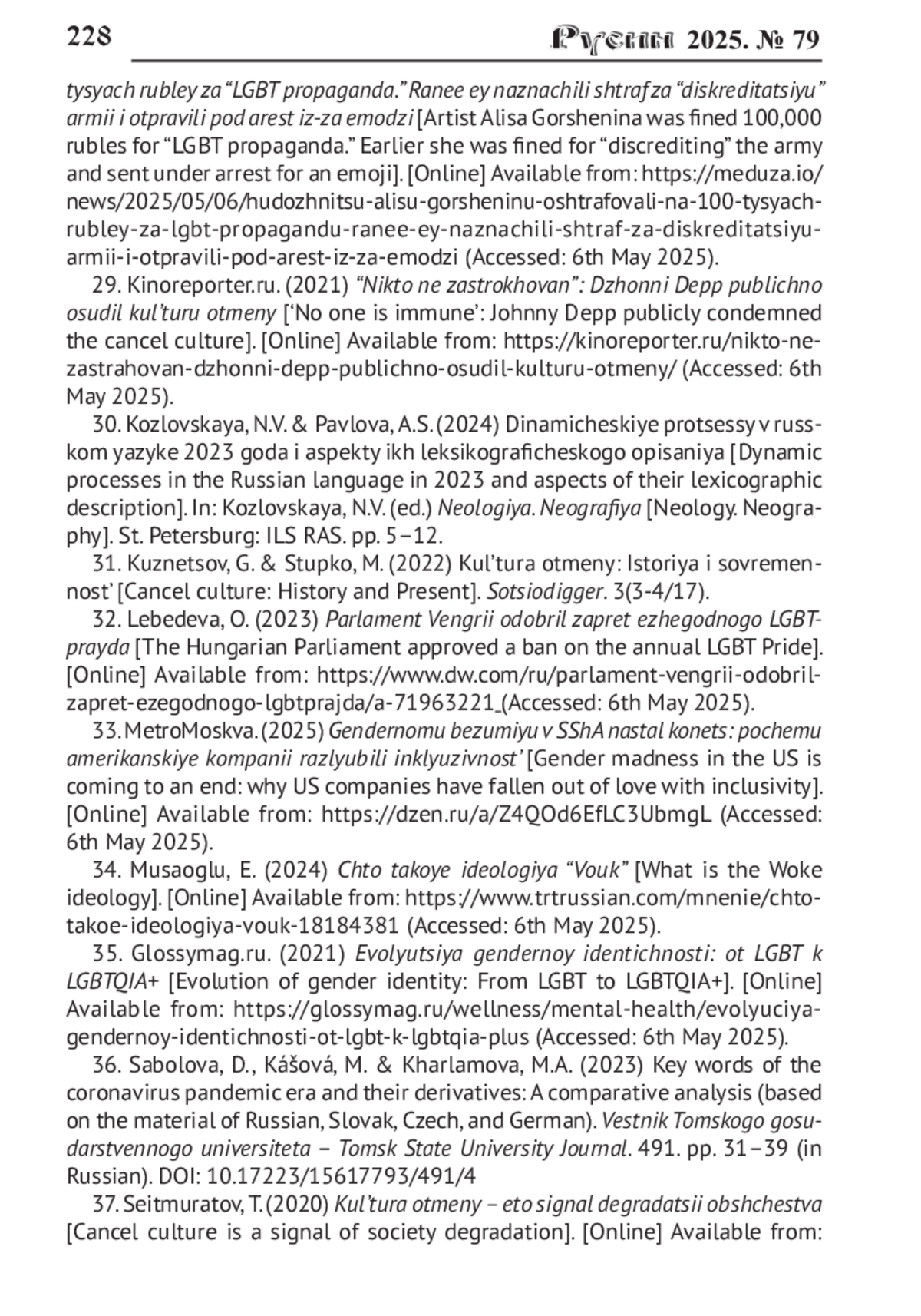 36. Саболова, Д., Кашова, М., Харламова, М.А. Ключевые слова эпохи пандемии коронавируса и их дериваты: сопоставительный анализ (на материале русского, словацкого, чешского и немецкого языков) // Вестник Томского государственного университета. 2023. № 491. С. 31-39. DOI: 10.17223/15617793/491/4