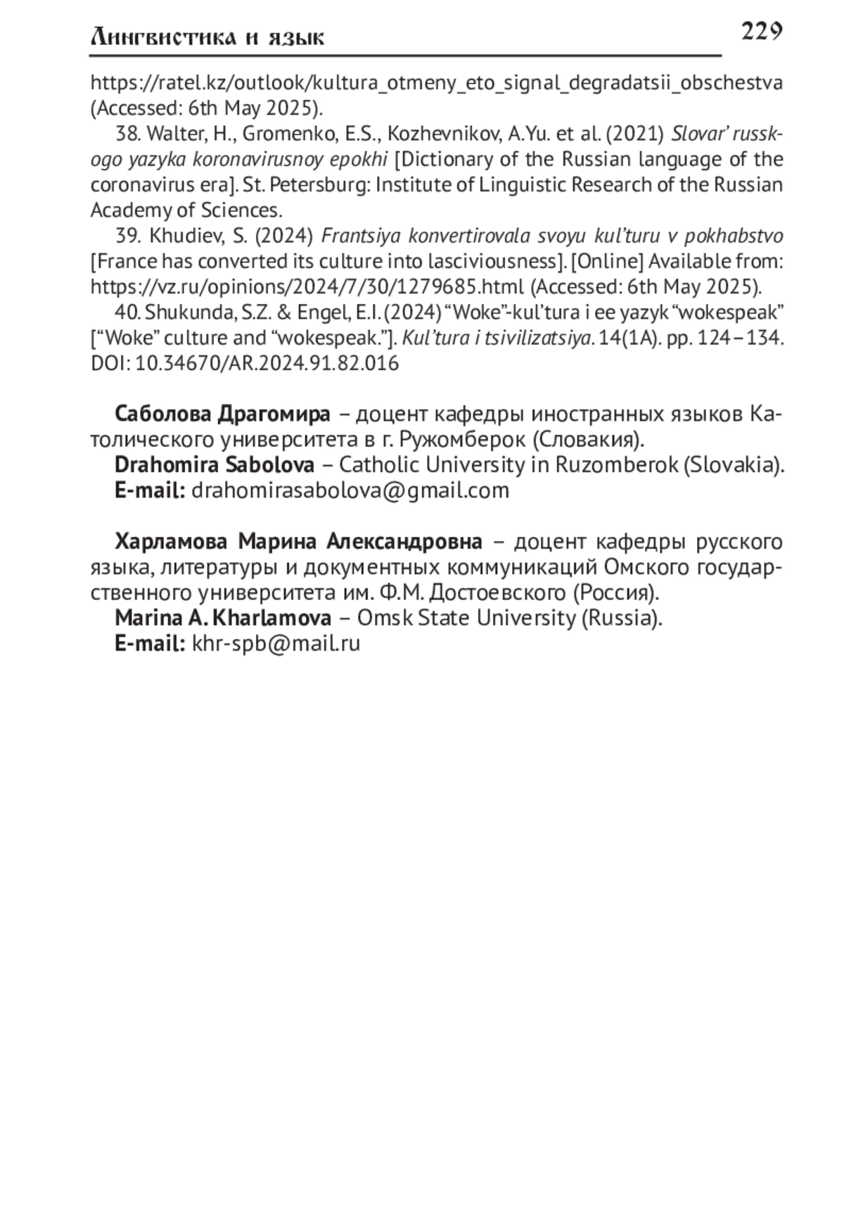 40. Шукунда С.З., Энгель Е.И. “Woke”-культура и её язык “wokespeak” // Культура и цивилизация. 2024. Т. 14, № 1А. С. 124-134. URL: http://publishing-vak.ru/file/archive-culture-2024-1/a15-shukunda-engel.pdf (дата обращения: 06.05.2025). DOI: 10.34670/AR.2024.91.82.016 EDN: CMVDEU