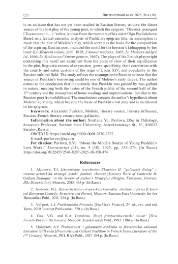 Статья строится в русле исследований русско-французских литературных связей и затрагивает проблему влияния комедий Мольера на творчество Пушкина. В фокусе внимания оказывается пока еще не изученный в отечественном литературоведении вопрос о непосредственном источнике утраченной пьесы юного поэта, к которой отсылает эпиграмма «Dis-moi, pourquoi l’Escamoteur <…>», известная по воспоминаниям его сестры О. С. Павлищевой. На основе лексико-семантического анализа названия эпиграммы Пушкина выдвигается предположение о том, что сюжет мольеровской комедии, послужившей основой для сочинения начинающего русского поэта, включал мотив похищения героини ее возлюбленным. Пьесы французского драматурга, содержащие этот мотив («Летающий доктор», опубл. 1819; «Любовь-целительница», 1665; «Лекарь поневоле», 1666; «Сицилиец, или Амур-живописец», 1667), рассматриваются с точки зрения его значимости в сюжете, языковых средств выражения, жанровой специфики, соотнесенности с придворно-салонными нравами эпохи правления Людовика XIV, известности в русском культурном поле. Проведенное исследование опровергает закрепившееся в российской науке предположение о том, что источником пушкинского заимствования мог стать один из ранних фарсов Мольера. Автор приходит к выводу, что комедия, на которую ориентировался Пушкин, носила галантный характер, отвечавший как вкусам французской публики второй половины XVII в., так и атмосфере домашних чтений-импровизаций, с детства знакомой русскому поэту. Выводы содержат авторскую гипотезу о мольеровской комедии, ставшей основой утраченной пьесы Пушкина и упомянутой в его эпиграмме.
