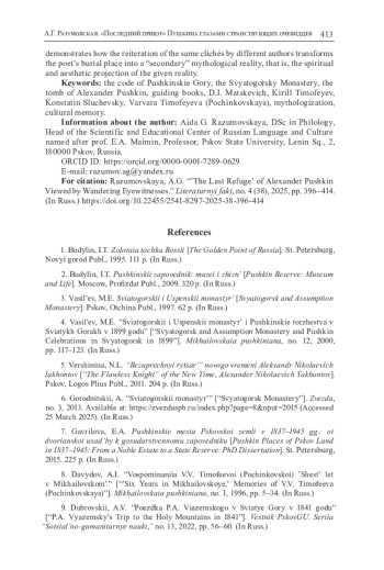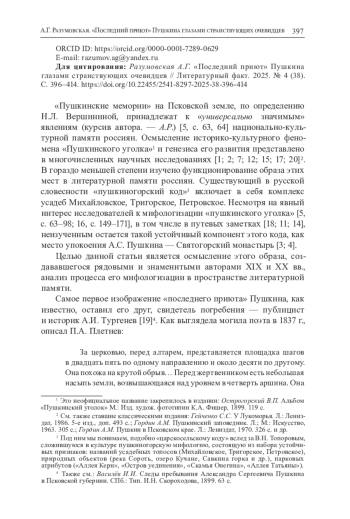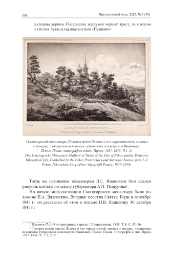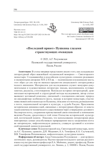 «Пушкинские мемории» на Псковской земле, по определению Н. Л. Вершининой, принадлежат к «универсально значимым» явлениям (курсив автора. — А. Р.) [5, c. 63, 64] национально-культурной памяти россиян. Осмысление историко-культурного феномена «Пушкинского уголка» и генезиса его развития представлено в многочисленных научных исследованиях [1; 2; 7; 12; 15; 17; 20]2. В гораздо меньшей степени изучено функционирование образа этих мест в литературной памяти россиян. Существующий в русской словесности «пушкиногорский код»3 включает в себя комплекс усадеб Михайловское, Тригорское, Петровское. Несмотря на явный интерес исследователей к мифологизации «пушкинского уголка» [5, с. 63–98; 16, с. 149–171], в том числе в путевых заметках [18; 11; 14], неизученным остается такой устойчивый компонент этого кода, как место упокоения А. С. Пушкина — Святогорский монастырь [3; 4].