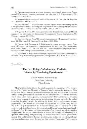 16. Разумовская А.Г. “Пушкинский уголок” России: мифологизация усадьбы в постусадебную эпоху // Русская усадьба: региональные и общекультурные аспекты: коллективная монография. Псков: ЛОГОС, 2015. С. 149-171. EDN: VMSUSF