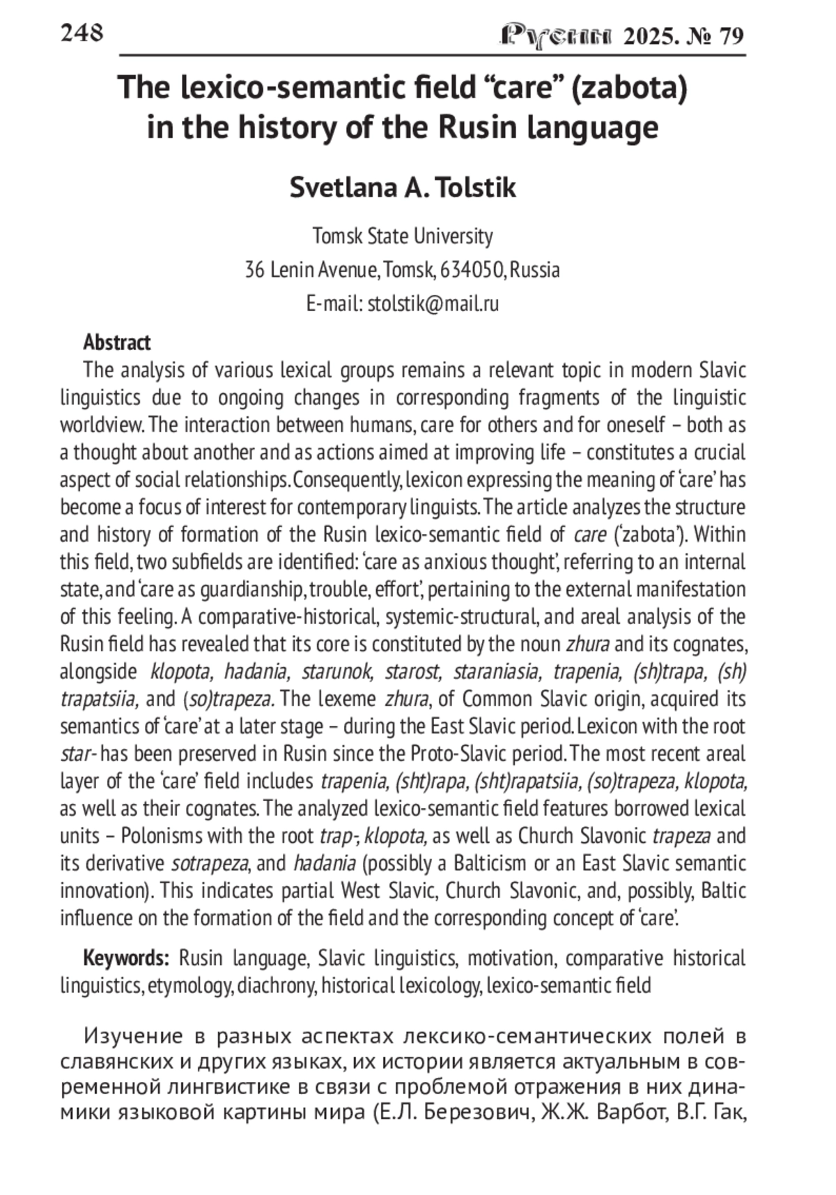 Анализ различных лексических групп является актуальным в современном славянском языкознании в связи с изменением соответствующих фрагментов языковой картины мира. Взаимодействие человека с другим человеком, забота о другом человеке / о себе как мысль о другом, а также действия, направленные на улучшение жизни, - очень важная часть отношений людей в обществе, поэтому лексика со значением ‘забота’ находится в сфере интересов современных языковедов. Анализируется структура и история формирования русинского лексико-семантического поля «забота». В структуре русинского лексико-семантического поля выделяются два субполя: ‘забота, беспокойная мысль’, т. е. внутреннее состояние и ‘забота, попечение, хлопоты’, т. е. внешнее проявление чувства. Сравнительно-исторический, системноструктурный и ареальный анализ русинского поля позволил выявить, что в его ядерной зоне находится существительное жура и однокорневая лексика клопота, гаданя, старунок, старость, стараня (ся), трапеня, (ш)трапа, (ш)трапация, (со)трапеза. Общеславянское по происхождению жура приобрело семантику заботы позже - в восточнославянский период. С праславянского периода в русинском сохраняется лексика с корнем стар-. Наиболее поздний ареальный слой поля «забота» - трапеня, (ш)трапа, (ш)трапация, (со)трапеза. клопота. а также их однокорневые слова. В анализируемом лексико-семантическом поле представлены заимствованные лексические единицы (полонизмы с корнем трап-. клопота, а также ц.-слав. трапеза, производное сотрапеза и гаданя (возможно, балтизм или вост.-слав. семантическая инновация), что говорит о частичном западнославянском, церковнославянском и, возможно, балтийском влиянии на формирование поля и соответствующего понятия «забота».