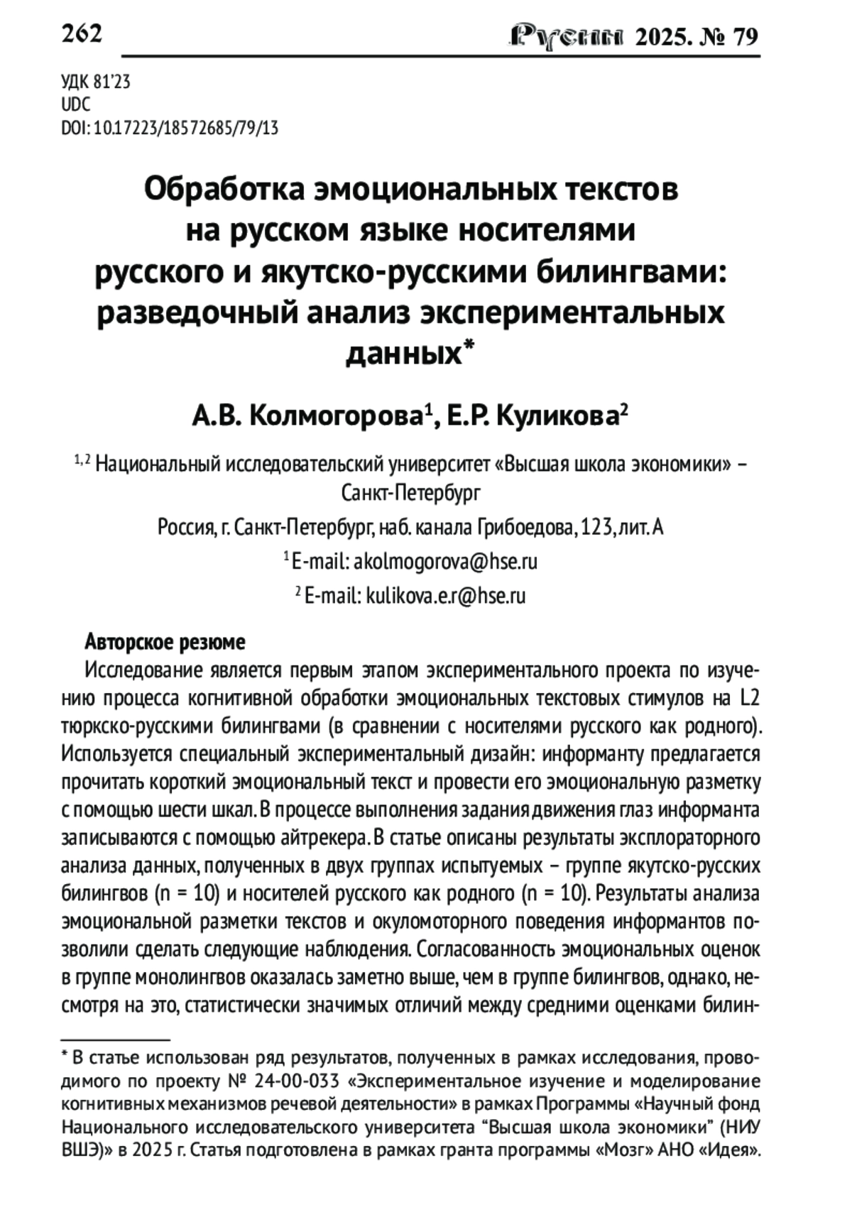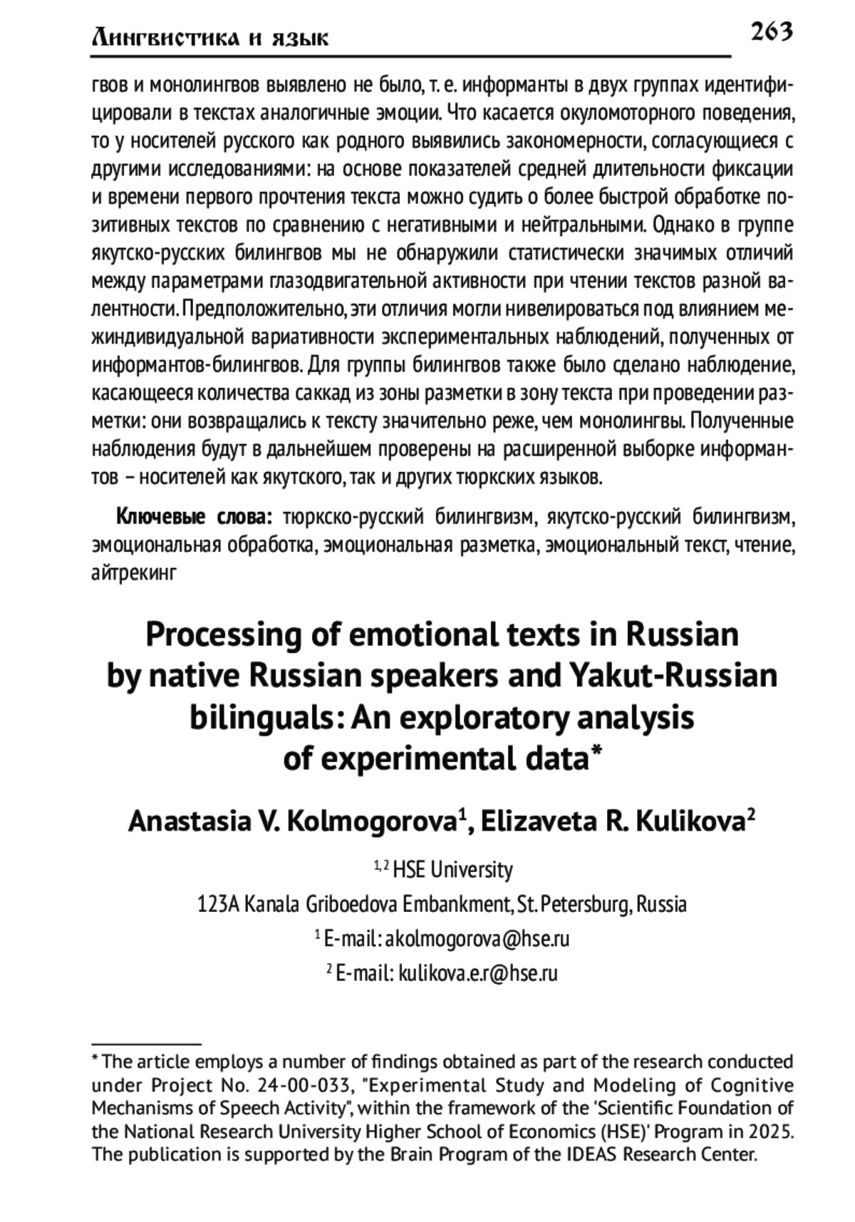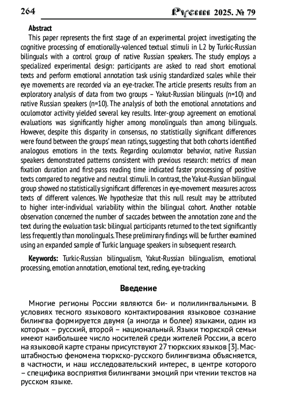 Исследование является первым этапом экспериментального проекта по изучению процесса когнитивной обработки эмоциональных текстовых стимулов на L2 тюркско-русскими билингвами (в сравнении с носителями русского как родного). Используется специальный экспериментальный дизайн: информанту предлагается прочитать короткий эмоциональный текст и провести его эмоциональную разметку с помощью шести шкал. В процессе выполнения задания движения глаз информанта записываются с помощью айтрекера. В статье описаны результаты эксплораторного анализа данных, полученных в двух группах испытуемых - группе якутско-русских билингвов (n = 10) и носителей русского как родного (n = 10). Результаты анализа эмоциональной разметки текстов и окуломоторного поведения информантов позволили сделать следующие наблюдения. Согласованность эмоциональных оценок в группе монолингвов оказалась заметно выше, чем в группе билингвов, однако, несмотря на это, статистически значимых отличий между средними оценками билингвов и монолингвов выявлено не было, т. е. информанты в двух группах идентифицировали в текстах аналогичные эмоции. Что касается окуломоторного поведения, то у носителей русского как родного выявились закономерности, согласующиеся с другими исследованиями: на основе показателей средней длительности фиксации и времени первого прочтения текста можно судить о более быстрой обработке позитивных текстов по сравнению с негативными и нейтральными. Однако в группе якутско-русских билингвов мы не обнаружили статистически значимых отличий между параметрами глазодвигательной активности при чтении текстов разной валентности. Предположительно, эти отличия могли нивелироваться под влиянием межиндивидуальной вариативности экспериментальных наблюдений, полученных от информантов-билингвов. Для группы билингвов также было сделано наблюдение, касающееся количества саккад из зоны разметки в зону текста при проведении разметки: они возвращались к тексту значительно реже, чем монолингвы. Полученные наблюдения будут в дальнейшем проверены на расширенной выборке информантов - носителей как якутского, так и других тюркских языков.