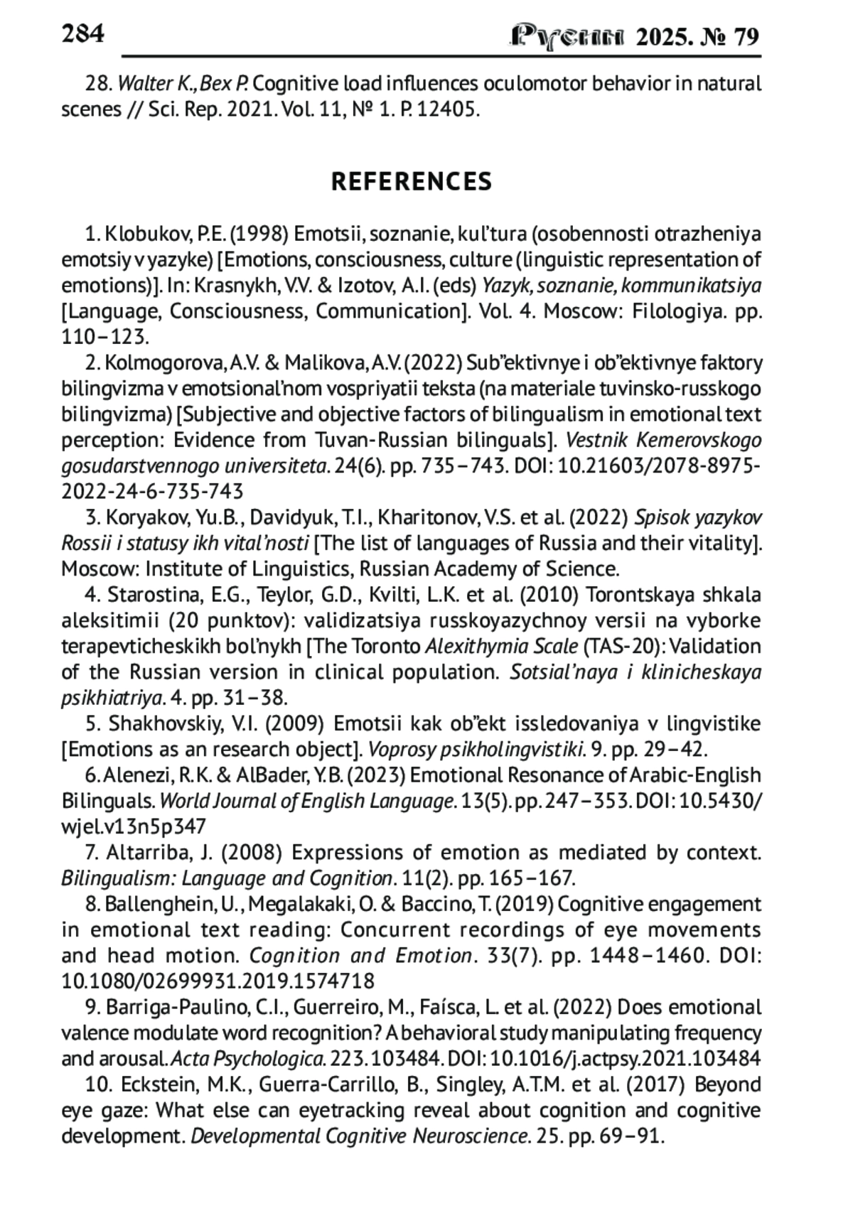 8. Ballenghein U., Megalakaki O., Baccino T. Cognitive engagement in emotional text reading: concurrent recordings of eye movements and head motion // Cognition and Emotion. 2019. № 33 (7). P. 1448-1460. DOI: 10.1080/02699931.2019.1574718