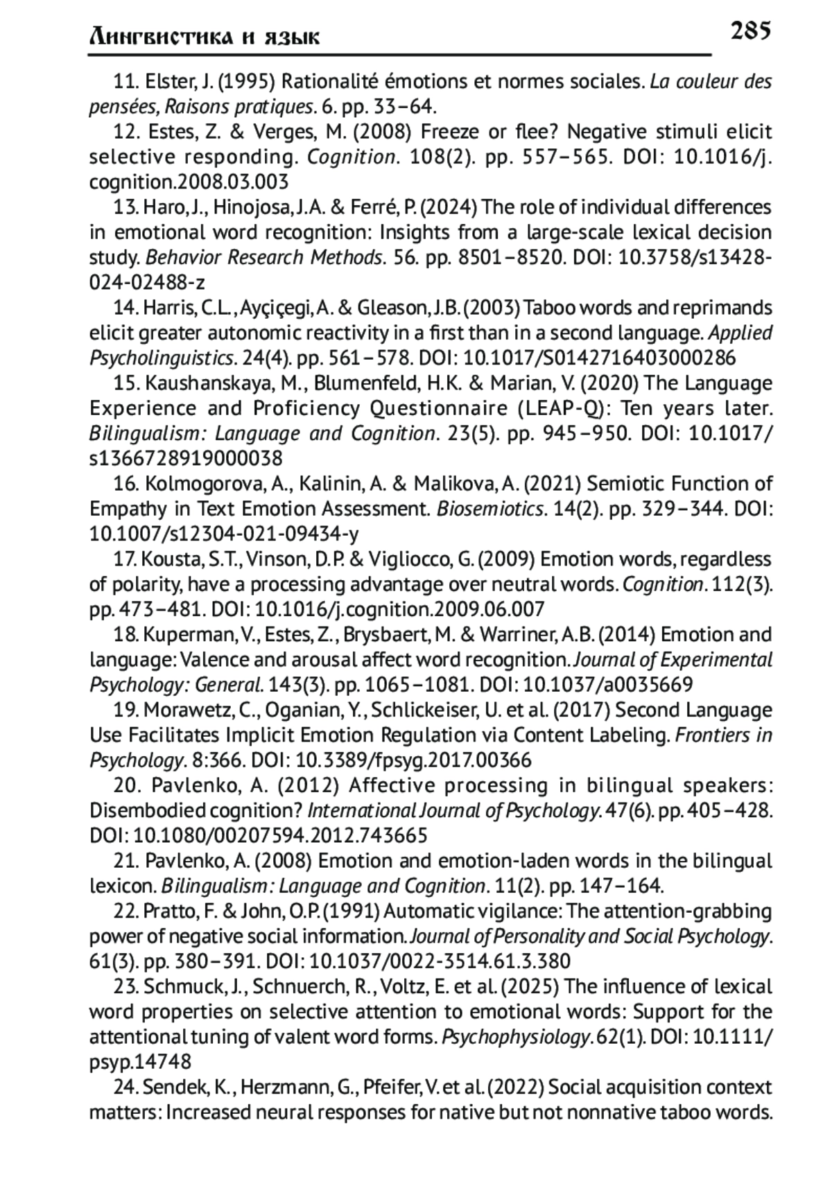 23. Schmuck J., Schnuerch R., Voltz E. et al. The influence of lexical word properties on selective attention to emotional words: Support for the attentional tuning of valent word forms // Psychophysiology. 2025. № 62 (1). DOI: 10.1111/psyp.14748 EDN: FGDSSG
