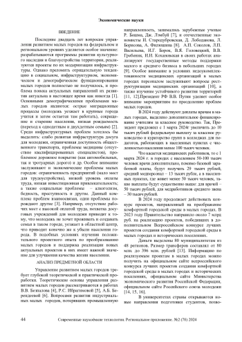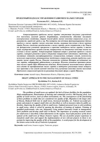 Актуализированы проблемы малых городов: отсутствие досуговых учреждений для населения, высокий уровень безработицы, изношенность объектов жилищно-коммунального хозяйства, старый жилой фонд, низкое качество социальных услуг, неразвитость городской среды и пр. Рассмотрены последствия функционирования данных проблем в малых городах: низкое качество жизни, миграция населения в более крупные города России, снижение рождаемости в малых городах, рост смертности и др. Описаны федеральные успешные программы и проекты поддержки малых городов, а также меры государственных органов власти, направленные на повышение качества жизни населения в малых городах. Актуализирован кадровый вопрос к решению проблем в малых городах, который решается путем открытия направлений подготовки студентов, позволяющих готовить квалифицированных специалистов, которые смогут, комплексно, используя современные инновационные тенденции в управлении, решать проблемы и развивать малые города России. Описана значимость создания Центров исследования малых городов, лабораторий урбанистики в регионах. Изучены успешные практики развития малого города Шуя (Ивановская область). Использование положительного проектного опыта по преобразованию малых городов и поддержке реализации новых актуальных проектов в них имеет важной значение для улучшения качества жизни населений. Предложен социальный проект по развитию досуговой сферы в городе Юрьевец.