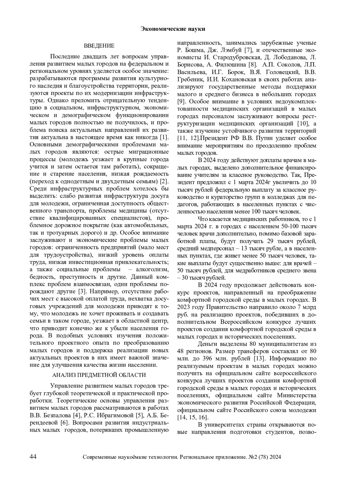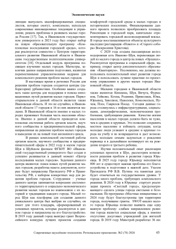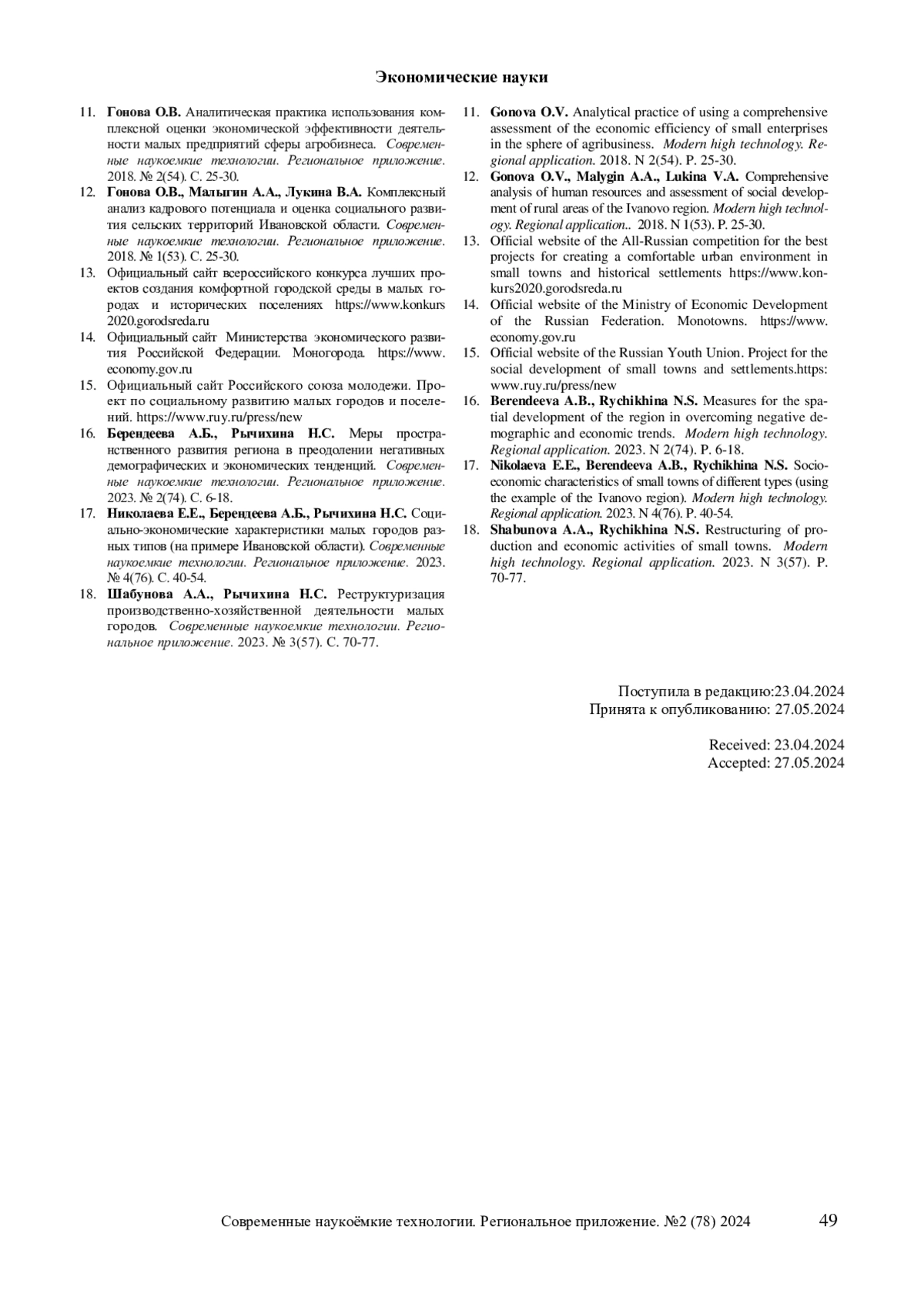 17. Николаева Е.Е., Берендеева А.Б., Рычихина Н.С. Социально-экономические характеристики малых городов разных типов (на примере Ивановской области). Современные наукоемкие технологии. Региональное приложение. 2023. № 4(76). С. 40-54. EDN: KAQUID