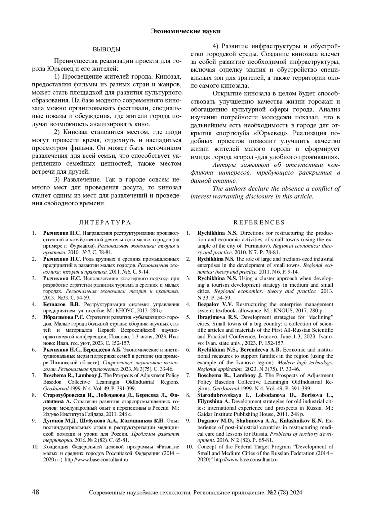 18. Шабунова А.А., Рычихина Н.С. Реструктуризация производственно-хозяйственной деятельности малых городов. Современные наукоемкие технологии. Региональное приложение. 2023. № 3(57). С. 70-77.