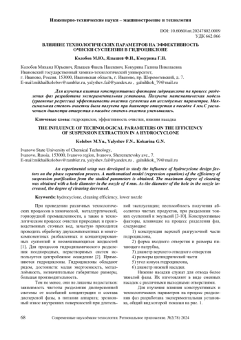 8. Гаврилин В.М., Афонин С.Б., Ялышев Ф.Н., Колобов М.Ю. Влияние диаметра насадки на эффективность очистки суспензии в гидроциклоне. Сборник материалов ХV Всероссийской научно-практической конференции “Надежность и долговечность машин и механизмов”. Иваново, 18 апреля 2024. С. 42-45. EDN: GOMCDY