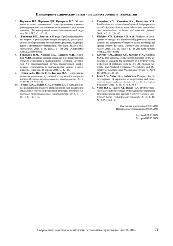 10. Верин Д.Ю., Валеев С.И., Булкин В.А. Гидродинамика цилиндроконического гидроциклона для разделения эмульсий с учетом эффективной вязкости. Вестник Казанского технологического университета. 2013. Т. 15, № 15. С. 117-119.