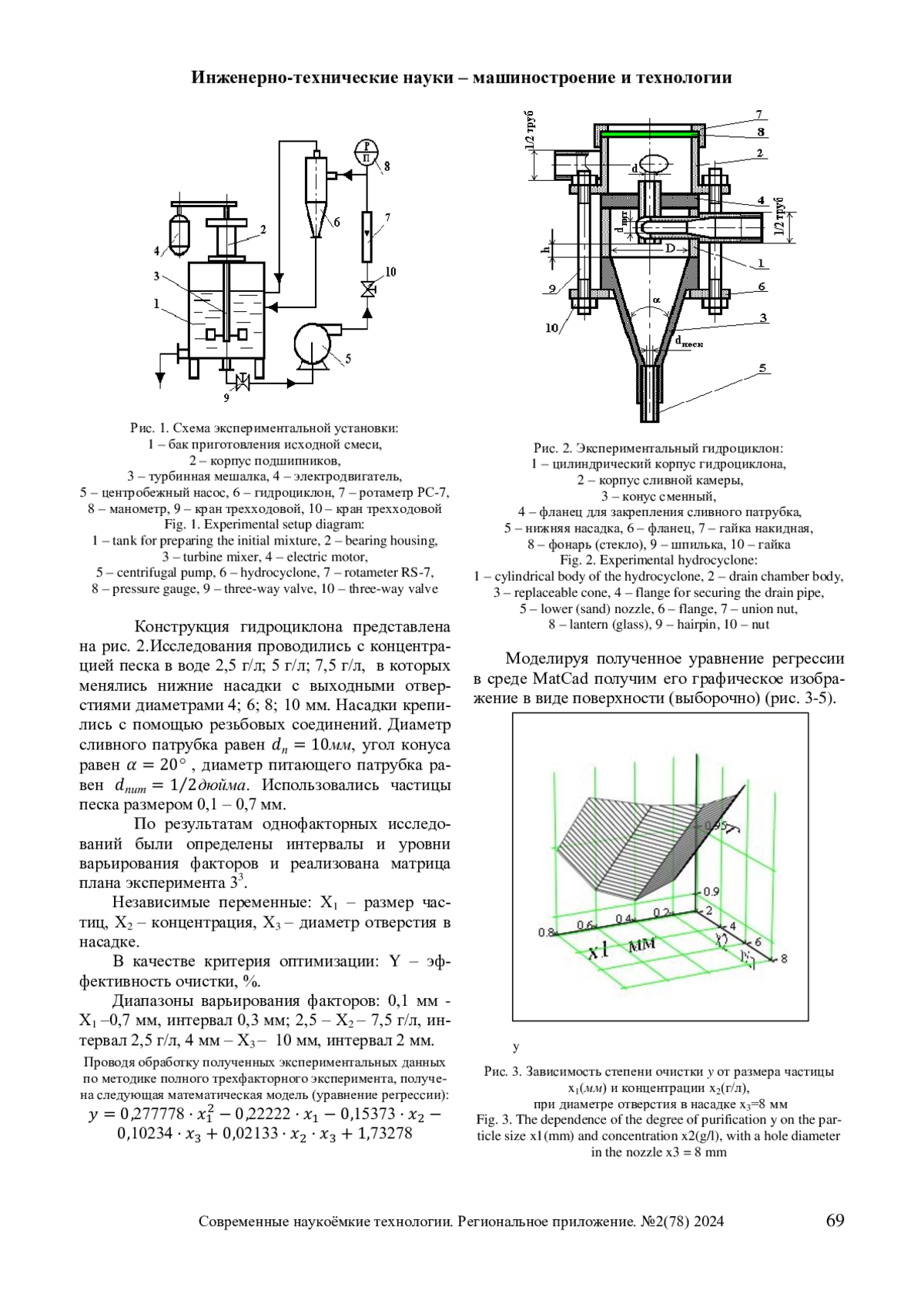 Для изучения влияния конструктивных факторов гидроциклона на процесс разделения фаз разработана экспериментальная установка. Получена математическая модель (уравнение регрессии) эффективности очистки суспензии от исследуемых параметров. Максимальная степень очистки была получена при диаметре отверстия в насадке 4 мм. С увеличением диаметра отверстия в насадке степень очистки уменьшалась.