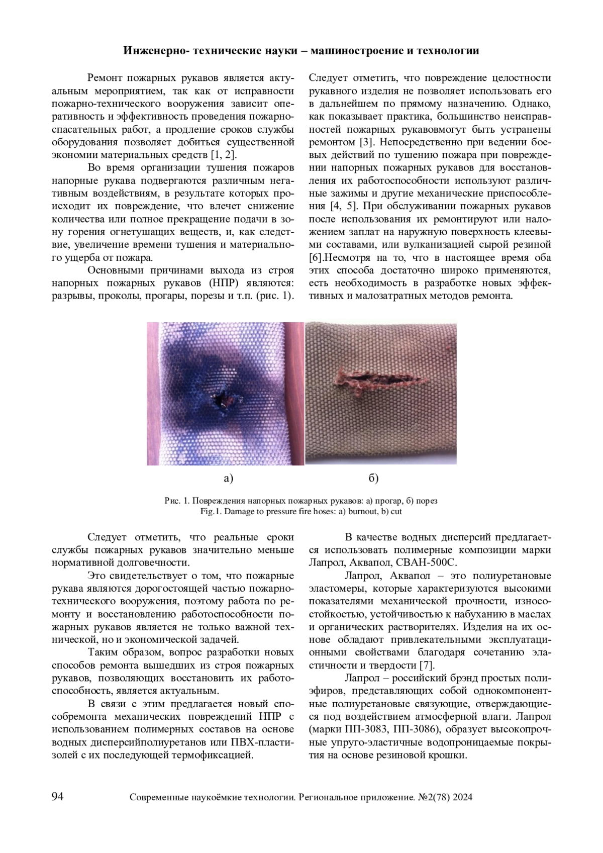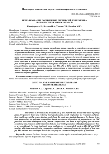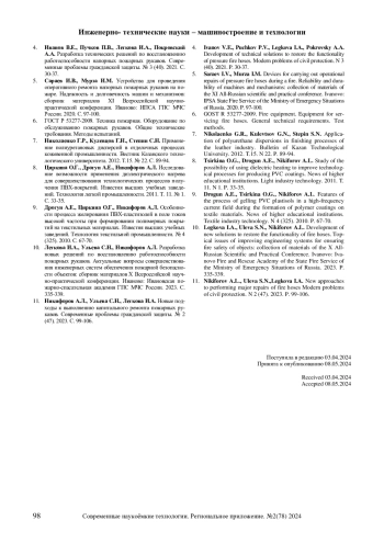 10. Легкова И.А., Ульева С.Н., Никифоров А.Л. Разработка новых решений по восстановлению работоспособности пожарных рукавов. Актуальные вопросы совершенствования инженерных систем обеспечения пожарной безопасности объектов: сборник материалов X Всероссийской научно-практической конференции. Иваново: Ивановская пожарно-спасательная академия ГПС МЧС России. 2023. С. 335-339. EDN: PNGIQJ