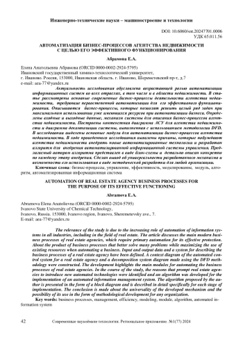 6. Абрамова Е.А. Построение модели автоматизации бизнес-процесса продажи объектов недвижимости. Сборник научных трудов вузов России “Проблемы экономики, финансов и управления производством” (пятьдесят третий выпуск). Иваново, ИГХТУ. 2023. С. 268-273.