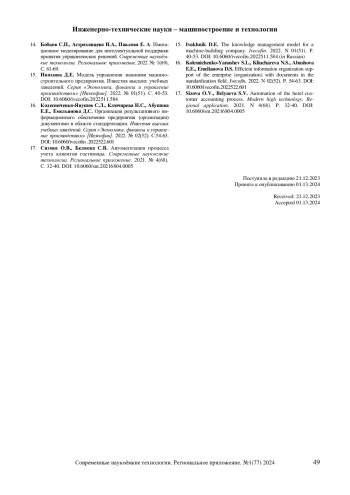 17. Сизова О.В., Беляева С.В. Автоматизация процесса учета клиентов гостиницы. Современные наукоемкие технологии. Региональное приложение. 2021. № 4(68). С. 32-40. DOI: 10.6060/snt.20216804.0005 EDN: OZQHEX