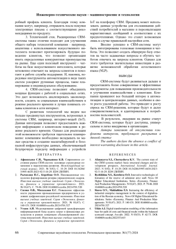 1. Афанасьева С.И., Чернышева К.В. Современное состояние рынка CRM-систем: основные структурные изменения и перспективы развития. Международный научный журнал. 2023. № 5(92). С. 18-29. DOI: 10.34286//1995-4638-2023-92-5-18-29 EDN: ZBTHPJ