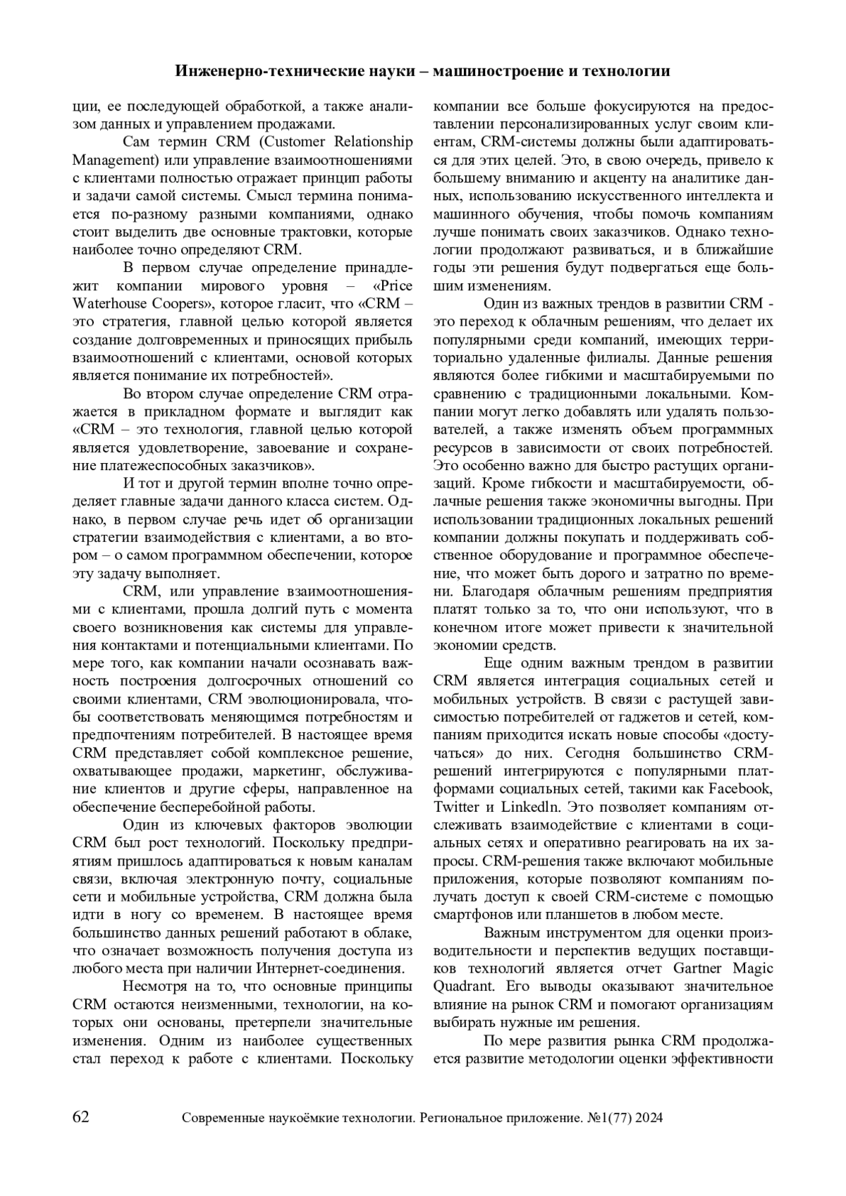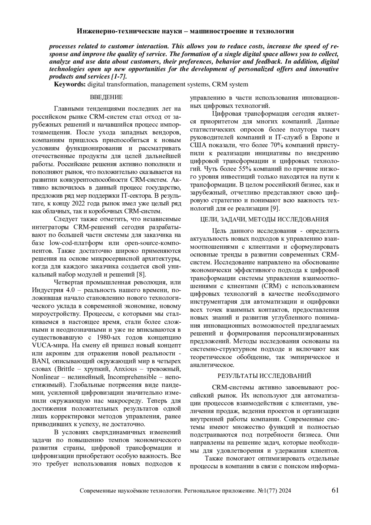 Актуальность данной статьи обусловлена тем, что в ситуации высокой неопределенности и быстрых перемен для многих компаний российского бизнеса стратегически важны процессы цифровой трансформации для усиления конкурентоспособности, и ключевым звеном здесь является установление взаимовыгодных и долгосрочных отношений с клиентами на качественно новом уровне. В условиях стремительного развития цифровых технологий и изменения поведения потребителей, предприятия сталкиваются с необходимостью переосмысления своих подходов к управлению отношениями с клиентами. Цифровая трансформация с использованием CRM-систем становится ключом к повышению эффективности, оптимизации процессов и улучшению качества обслуживания клиентов. Цифровые технологии предоставляют широкий спектр инструментов для автоматизации и цифровизации процессов, связанных с взаимодействием с клиентами. Это позволяет сократить затраты, повысить скорость реагирования и улучшить качество обслуживания. Формирование единого цифрового пространства позволяет собирать, анализировать и использовать данные о клиентах, их предпочтениях, поведении и обратной связи. Кроме того, цифровые технологии открывают новые возможности для развития персонализированных предложений, и инновационных продуктов и услуг [1-7].