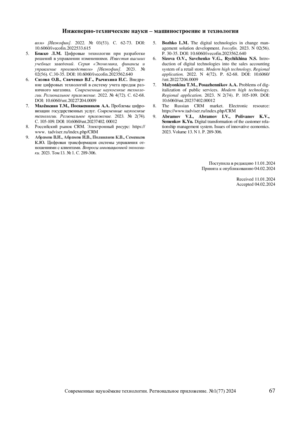 9. Абрамов В.И., Абрамов И.В., Поливанов К.В., Семенков К.Ю. Цифровая трансформация системы управления отношениями с клиентами. Вопросы инновационной экономики. 2023. Том 13. № 1. С. 289-306. EDN: VMOIBH