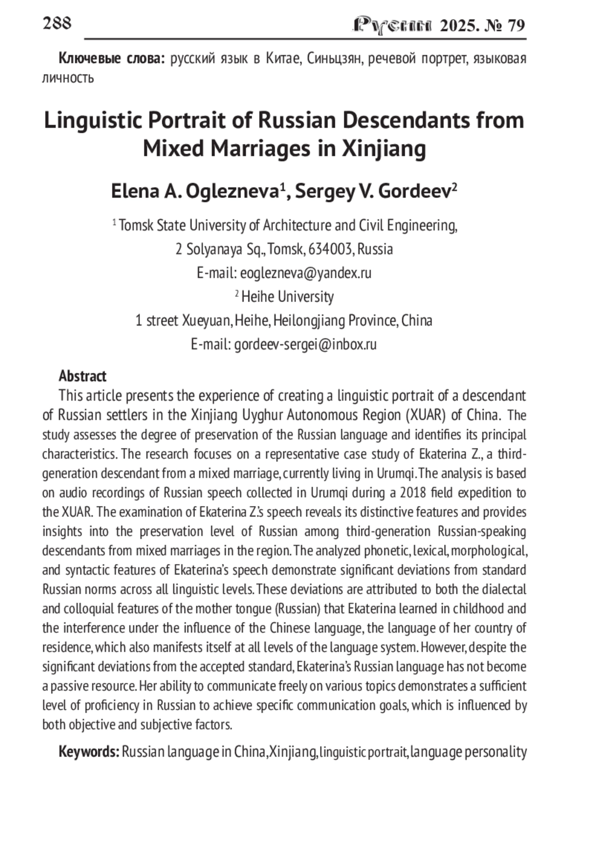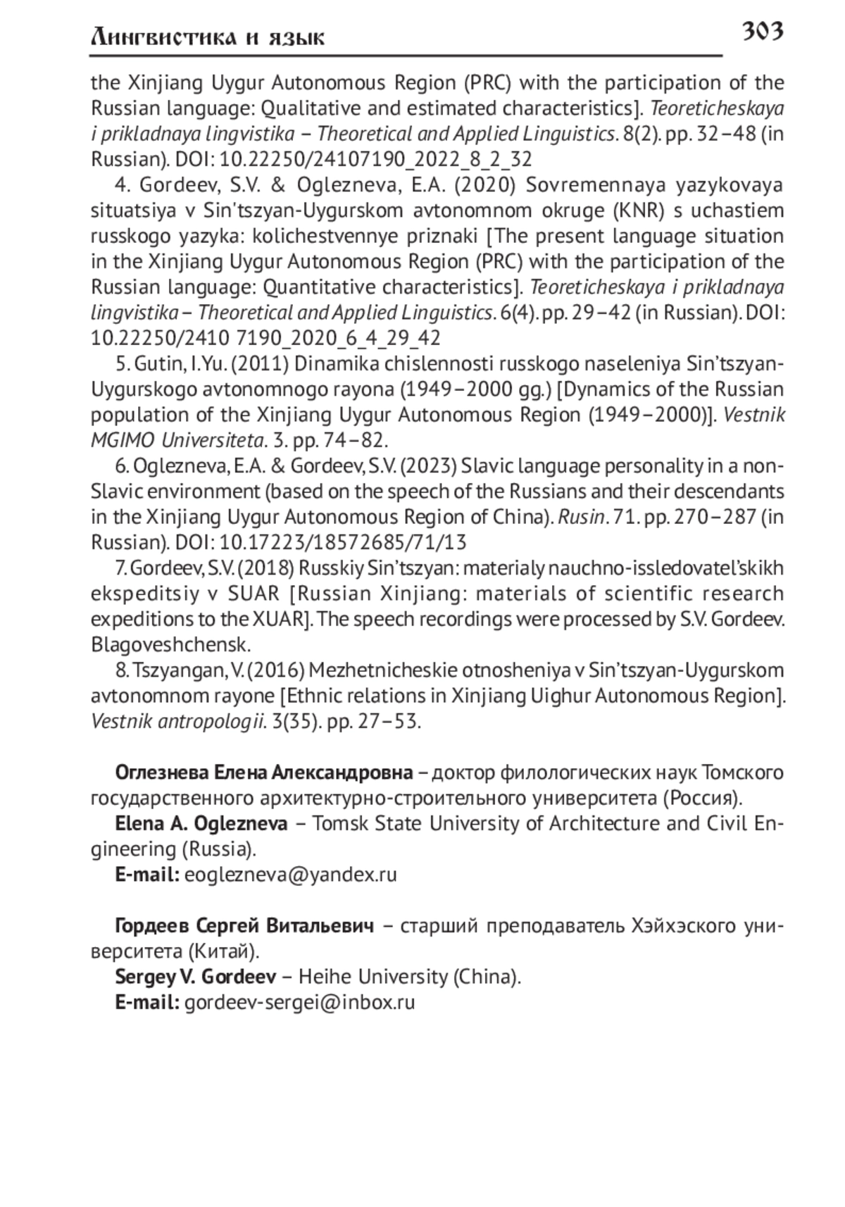 6. Оглезнева Е.А., Гордеев С.В. Славянская языковая личность в неславянском окружении (на материале речи русских и их потомков в Синьцзян-Уйгурском автономном районе КНР) // Русин. 2023. № 71. С. 270-287. DOI: 10.17223/18572685/71/13 EDN: UAIEZM