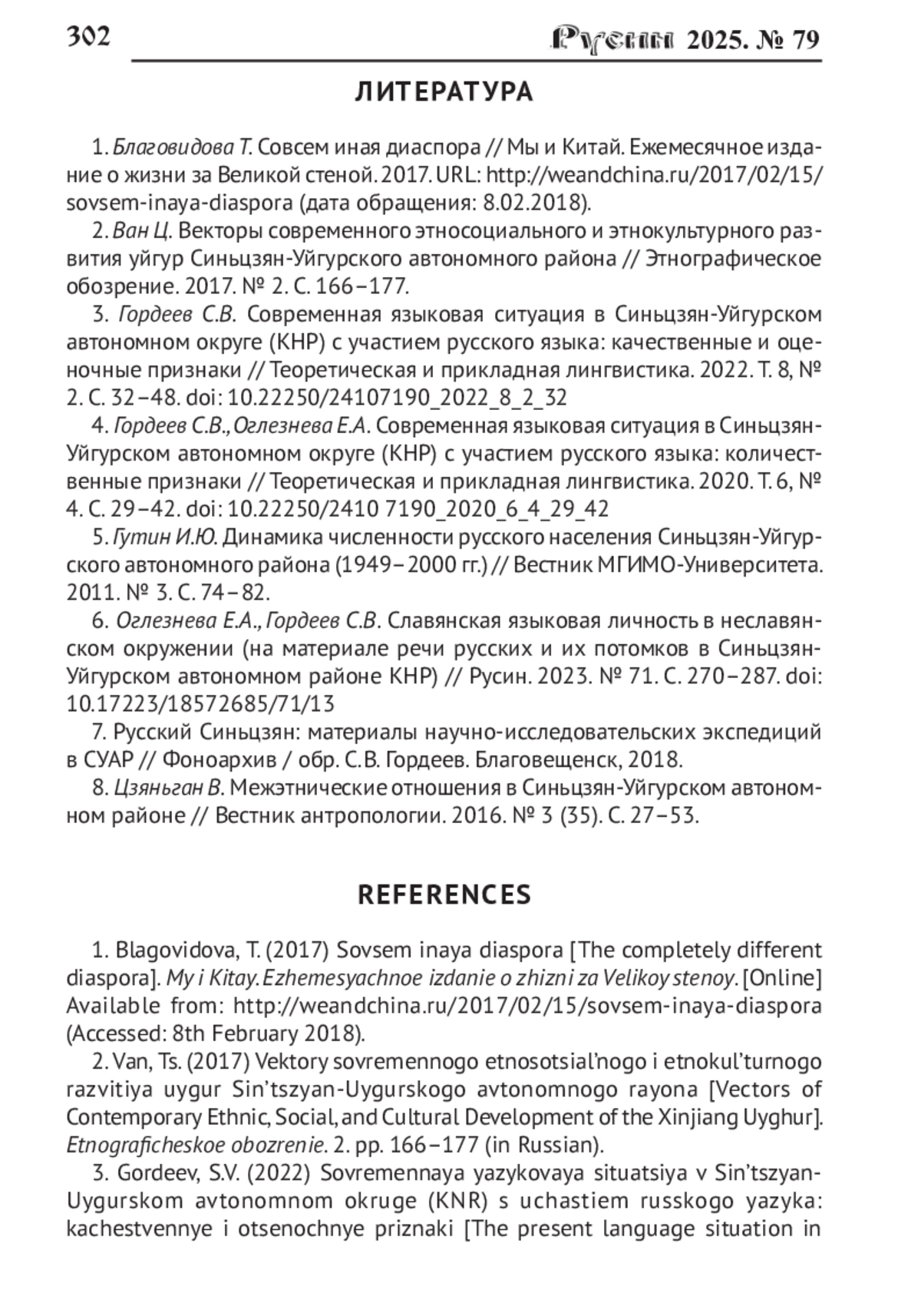 3. Гордеев С.В. Современная языковая ситуация в Синьцзян-Уйгурском автономном округе (КНР) с участием русского языка: качественные и оценочные признаки // Теоретическая и прикладная лингвистика. 2022. Т. 8, № 2. С. 32-48. DOI: 10.22250/24107190_2022_8_2_32 EDN: NJMOKR