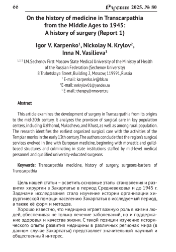 Цель нашей статьи – осветить основные этапы становления и развития хирургии в Закарпатье в период Средневековья и до 1945 г. Задачами исследования стало изучение истории организации хирургической помощи населению Закарпатья в исследуемый период, а также её форм и методов.