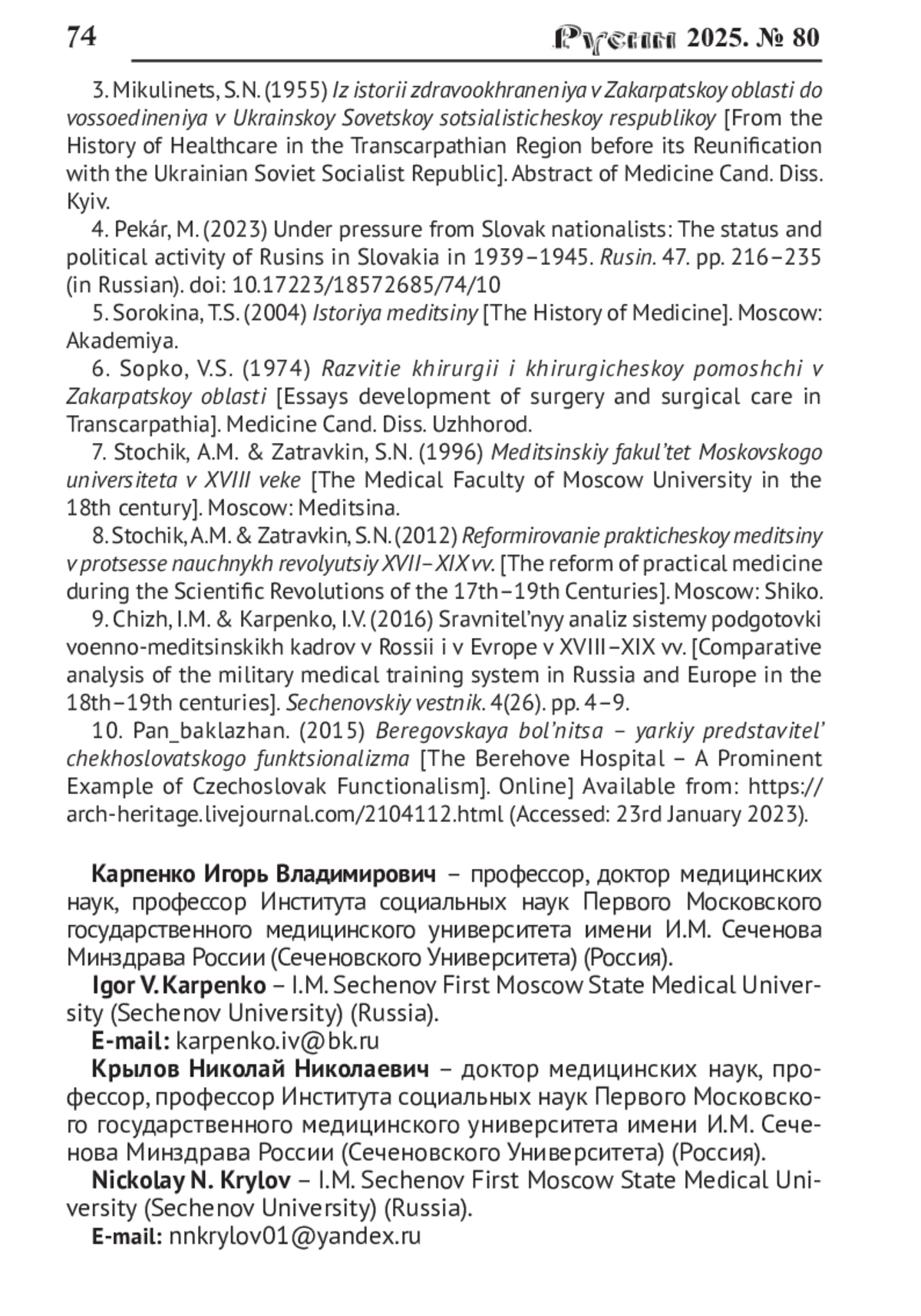 6. Сопко В.С. Развитие хирургии и хирургической помощи в Закарпатской области: автореф. дис.. канд. мед. наук. Ужгород,1974. 26 с.