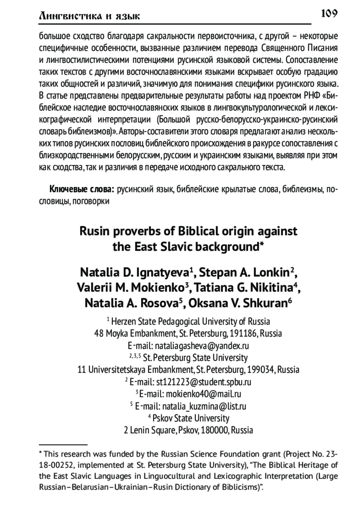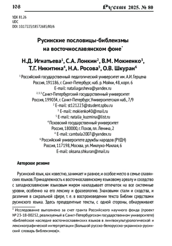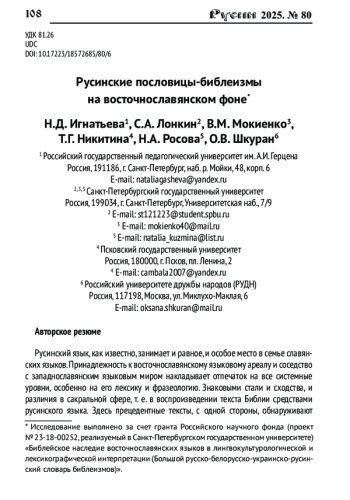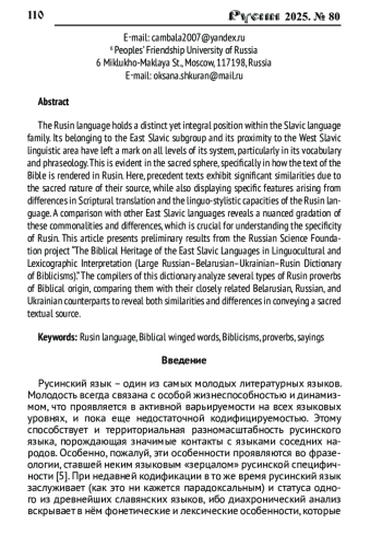 Русинский язык, как известно, занимает и равное, и особое место в семье славянских языков. Принадлежность к восточнославянскому языковому ареалу и соседство с западнославянским языковым миром накладывает отпечаток на все системные уровни, особенно на его лексику и фразеологию. Знаковыми стали и сходства, и различия в сакральной сфере, т. е. в воспроизведении текста Библии средствами русинского языка. Здесь прецедентные тексты, с одной стороны, обнаруживают большое сходство благодаря сакральности первоисточника, с другой - некоторые специфичные особенности, вызванные различием перевода Священного Писания и лингвостилистическими потенциями русинской языковой системы. Сопоставление таких текстов с другими восточнославянскими языками вскрывает особую градацию таких общностей и различий, значимую для понимания специфики русинского языка. В статье представлены предварительные результаты работы над проектом РНФ «Библейское наследие восточнославянских языков в лингвокультурологической и лексикографической интерпретации (Большой русско-белорусско-украинско-русинский словарь библеизмов)». Авторы-составители этого словаря предлагают анализ нескольких типов русинских пословиц библейского происхождения в ракурсе сопоставления с близкородственными белорусским, русским и украинским языками, выявляя при этом как сходства, так и различия в передаче исходного сакрального текста.