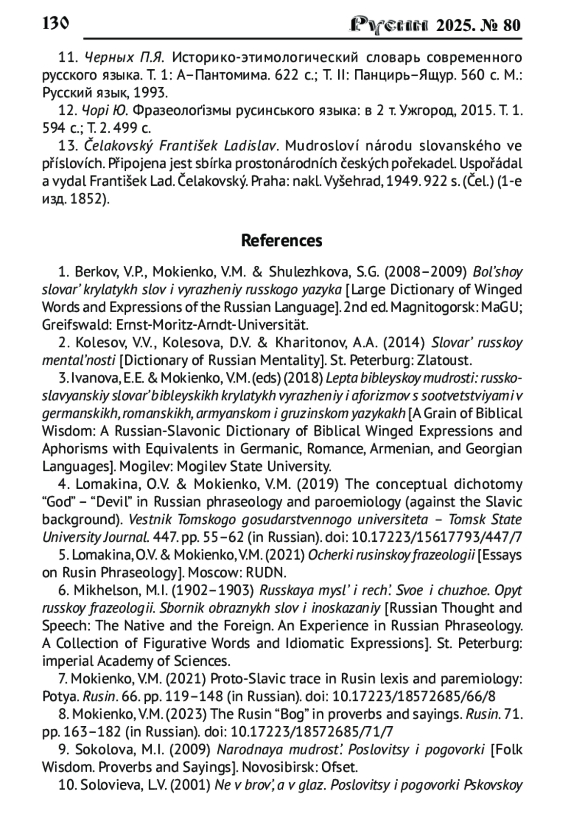 8. Мокиенко В.М. Русинский Бог в пословицах и поговорках // Русин. 2023. № 71. С. 163-182. DOI: 10.17223/18572685/71/7 EDN: VRZALU