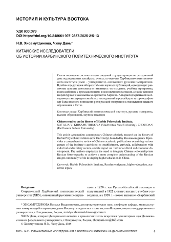 Статья посвящена систематизации сведений о существующих на сегодняшний день исследованиях китайских ученых по истории Харбинского политехнического института (ныне – университета), основанного русскими эмигрантами. В работе представлен обзор китайских научных публикаций, освещающих различные аспекты деятельности института: его создание, учебные программы, взаимодействие с промышленными и военными ведомствами, а также влияние на культурное и экономическое развитие Харбина. Авторы подчеркивают необходимость интеграции китайских исследований в российскую историографию для более полного понимания роли русской эмиграции в становлении высшего образования в Китае.