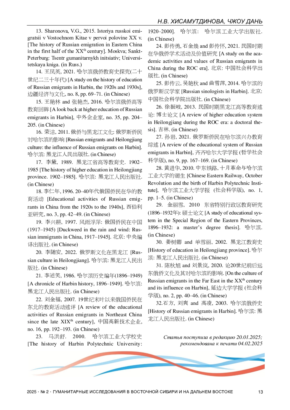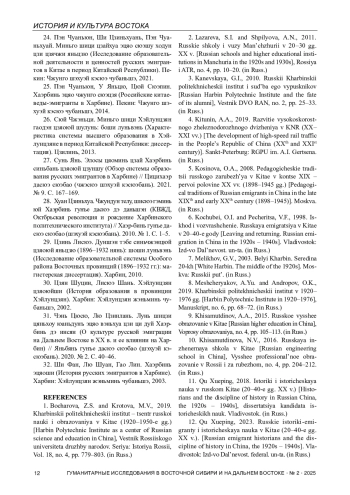 14. Ван Фэнъин. Хаэрбинь эцяо цзяоюйши таньцзю (эр ши шицзи эр сань ши няньдай) (Исследование по истории образования русских эмигрантов в Харбине (1920-е - 1930-е гг.)) // Бянь-цзян цзинцзи юйвэньхуа. 2021. № 8. С. 69-71.