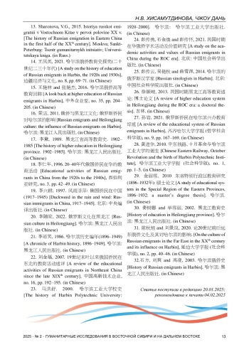 15. Ван Яньлинь, Чжан Яньцзе. Хаэрбинь эцяо гаодэн цзяоюй хуэймоу (Воспоминания о высшем образовании русских эмигрантов в Харбине) // Чжунвай циецзя. 2016. № 35. С. 204-205.