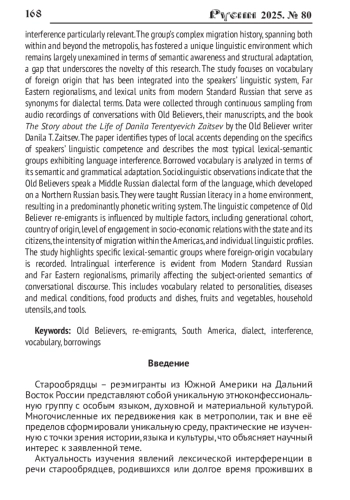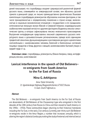 Старообрядцы - реэмигранты из Южной Америки на Дальний Восток России являются потомками старообрядцев часовенного толка, эмигрировавших в первые десятилетия ХХ в. из России в Китай, а затем в 1940-1950-е гг. переселившихся в Южную Америку. В начале ХХІ в. начался процесс их возвращения на историческую родину - в Россию, в том числе на Дальний Восток. В настоящее время на территории Амурской области проживают более тридцати старообрядцев-реэмигрантов, с каждым годом их количество увеличивается, что, несомненно, влияет на диалектный ландшафт региона, в связи с чем изучение явлений внешней и внутренней лексической интерференции актуально. Многочисленные передвижения старообрядцев как в метрополии, так и вне её пределов сформировали особую языковую среду, практические не изученную с точки зрения семантического осознания и структурной адаптации, что объясняет новизну поставленной проблемы. Объектом изучения являются адаптированная к системе говора лексика иноязычного происхождения, дальневосточные регионализмы, лексемы современного русского литературного языка, являющиеся синонимами-дублетами диалектных слов говора старообядцев. Материал получен методом сплошной выборки из аудиозаписей диалектной речи, рукописей старообрядцев, книги писателя-старообрядца Д. Т. Зайцева «Повесть и житие Данилы Терентьевича Зайцева». Выделяются типы носителей говора в зависимости от особенностей их языковой компетенции; описываются наиболее типичные лексикосемантические группы, включающие в свой состав лексику, появившуюся в говоре в результате интерференции. Иноязычная лексика охарактеризована с точки зрения семантической и грамматической адаптации. Данные социолингвистических наблюдений показывают, что старообрядцы владеют среднерусской диалектной формой русского языка, сложившейся на севернорусской основе; они обучались русской грамоте в домашней среде; их письмо преимущественно фонетическое. Языковая компетенция старообрядцев-реэмигрантов обусловлена многими факторами, в том числе принадлежностью к определенному поколению и стране исхода; включенностью в социально-экономические отношения с государством и его гражданами; интенсивностью миграции внутри Южной и Северной Америки; индивидуальными особенностями языковой личности и другими факторами. Выделены лексико-семантические группы, в которых зафиксирована лексика иноязычного происхождения. Внутренняя интерференция представлена лексикой современного русского литературного языка и дальневосточными регионализмами, прежде всего единицами предметной семантики, функционирующими в разговорном дискурсе и денотативно соотнесёнными с наименованиями человека, болезней и болезненных состояний, пищевых продуктов и блюд, фруктов и овощей, наименованиями бытовой утвари и орудий труда и т. д.