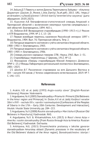 2. Аргудяева Ю.В. Старообрядцы в Приамурье и Приморье // Конфессии народов Сибири в XVII - начале XX в.: развитие и взаимодействие. Иркутск, 2005. С. 204-215. EDN: AWJBPT