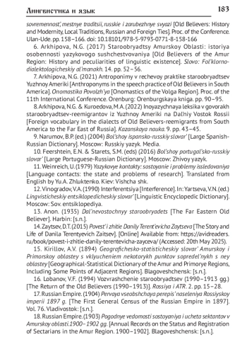 5. Архипова Н.Г. Динамические процессы в лексике говоров старообрядцев Амурской области // Старообрядчество: история и современность, местные традиции, русские и зарубежные связи: материалы VI Междунар. науч.-практ. конф. Улан-Удэ, 2015. С. 158-166. DOI: 10.18101/978-5-9793-0771-8-158-166 EDN: UPOWXF