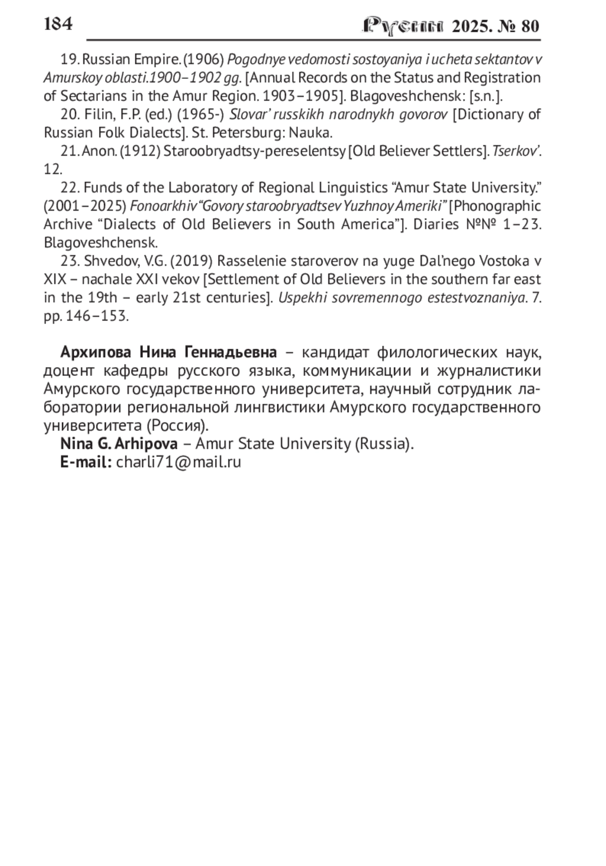 6. Архипова Н.Г. Старообрядцы Амурской Области: история особенности языкового существования // Слово: Фольклорно-диалектологический альманах. Вып. 14. Благовещенск, 2017. С. 52-56.