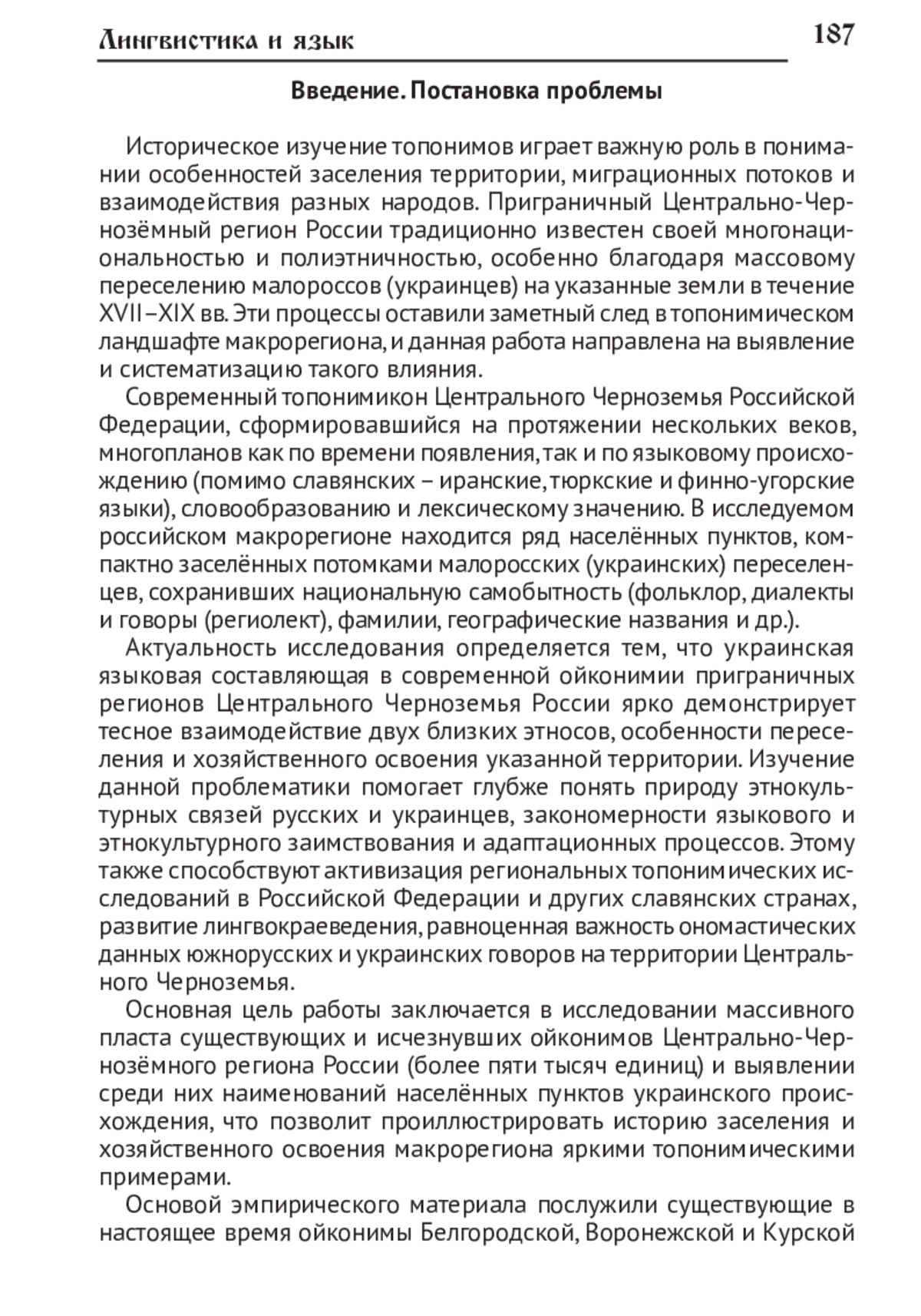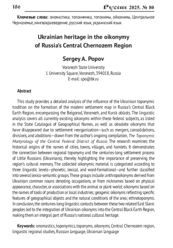 Детально анализируется влияние украинской топонимической традиции на формирование современной карты населённых пунктов Центрального Черноземья России, включая такие регионы, как Белгородская, Воронежская и Курская области. Лингвистическому анализу подверглись все существующие в настоящее время ойконимы указанных субъектов Российской Федерации, включенные в Государственный каталог географических названий, а также ойконимы, исчезнувшие в результате реорганизации населённых пунктов (в форме слияния, присоединения. выделения, разделения), их упразднения и переименования, входящие в формируемый автором «Топонимический мартиролог Центрального федерального округа России». Рассматриваются исторические аспекты возникновения названий городов, посёлков, сёл, хуторов и деревень; показана связь региональной топонимии с процессом расселения малороссов (украинцев) на протяжении нескольких столетий; демонстрируется значимость сохранения культурной памяти региона. Собранный ойконимический материал распределён по трём языковым уровням (фонетический, лексический, словообразовательный) и нескольким лексико-семантическим группам (антропоойконимы, основы которых содержат украинскую нарицательную лексику, обозначающую род занятий человека, прозвища, данные их носителям по внешнему виду, характеру, ассоциациям с животным и растительным миром; ойконимы, в основу которых положены названия орудий производства, род занятий населения; геогенные ойконимы, в основе которых содержатся различные признаки географических объектов, природных условий местности, этнотопонимы). Сделан вывод, что многовековые языковые контакты двух родственных восточнославянских народов привели к появлению украинских ойконимов в Центральном Черноземье России и сделали их частью русской национальной культуры.