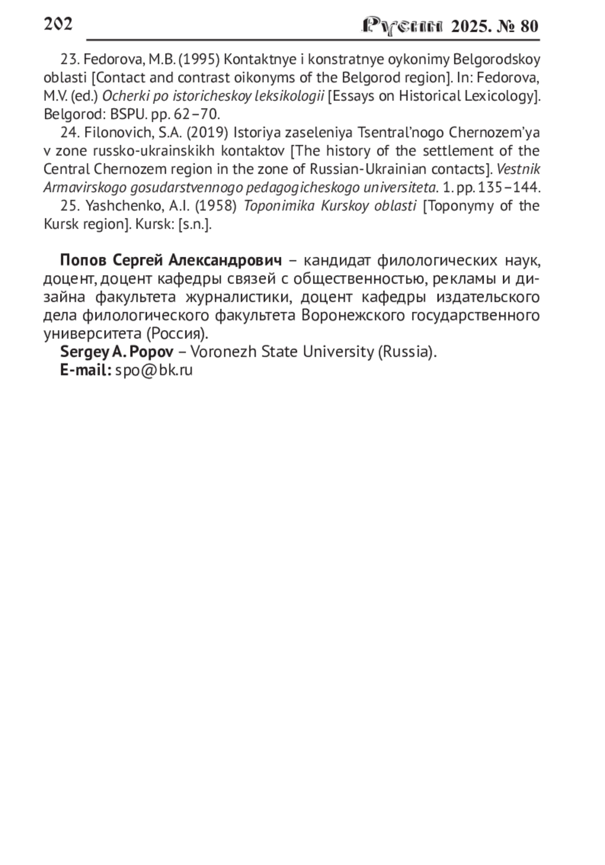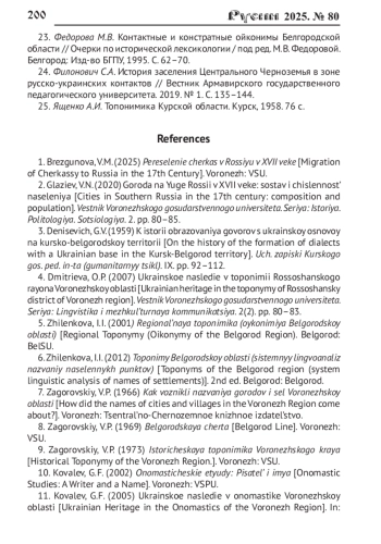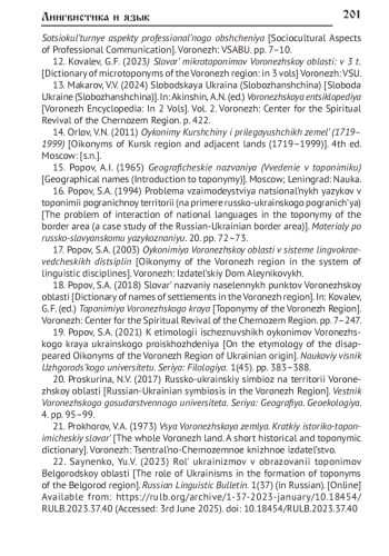 16. Попов С.А. Проблема взаимодействия национальных языков в топонимии пограничной территории (на примере русско-украинского пограничья) // Материалы по русско-славянскому языкознанию. Воронеж, 1994. Вып. 20. С. 72-73. EDN: XTLJXF