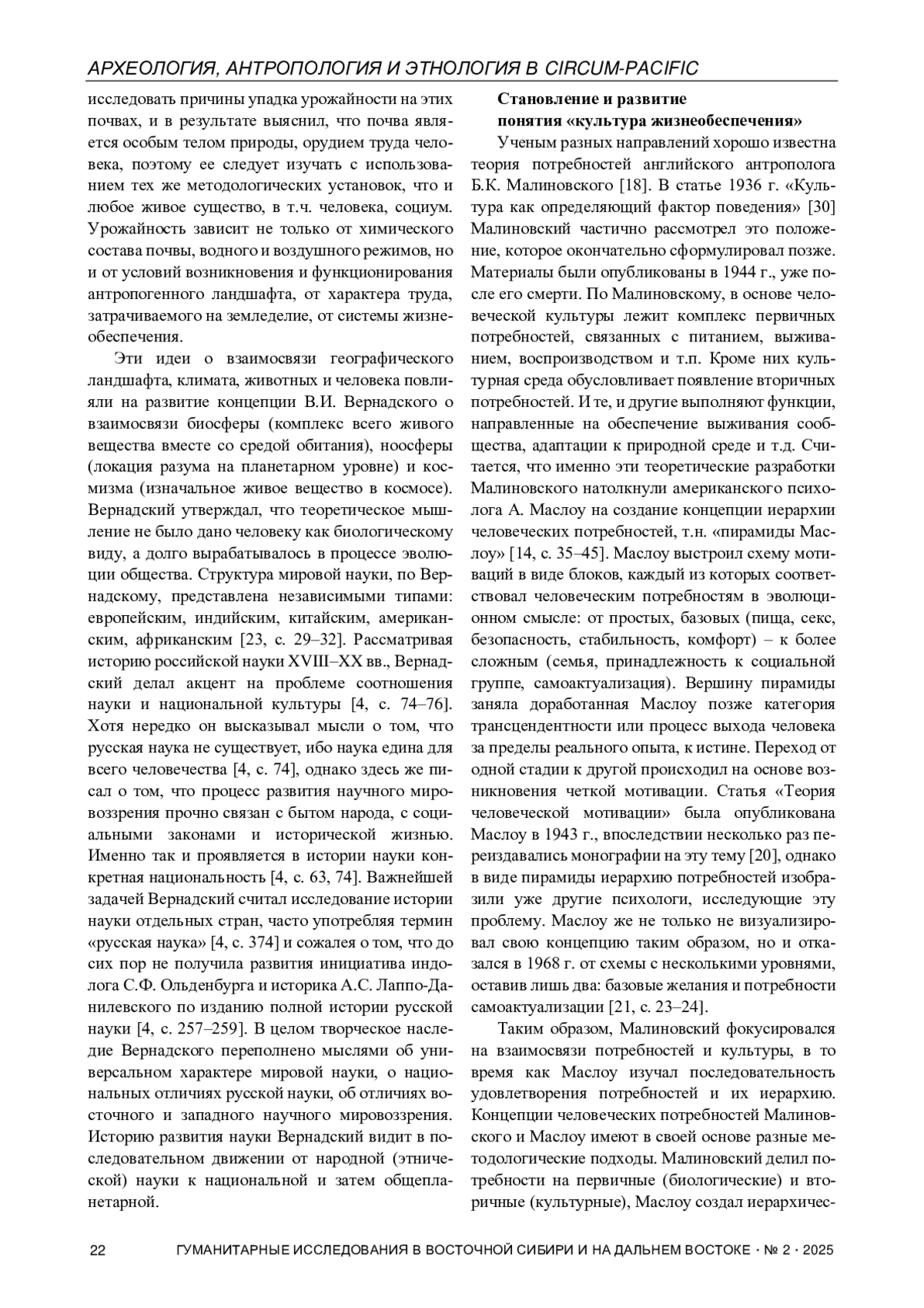 В статье анализируется научная парадигма возникновения и функционирования понятия «культура жизнеобеспечения». Кратко наметив идейные контуры становления национального варианта науки в России, автор обращается к истории возникновения понятия «жизнеобеспечение», его связи с теоретическими разработками Б. Малиновского и А. Маслоу, и демонстрирует вклад советских и российских ученых в разработку концепции «культуры жизнеобеспечения». В заключительной части эффективность использования данного методологического подхода в антропологии и этнографии показана на примере изучения этнокультурных особенностей жизнеобеспечения коренных народов амуро-сахалинского региона.