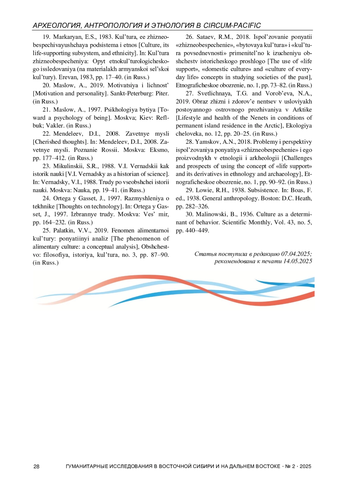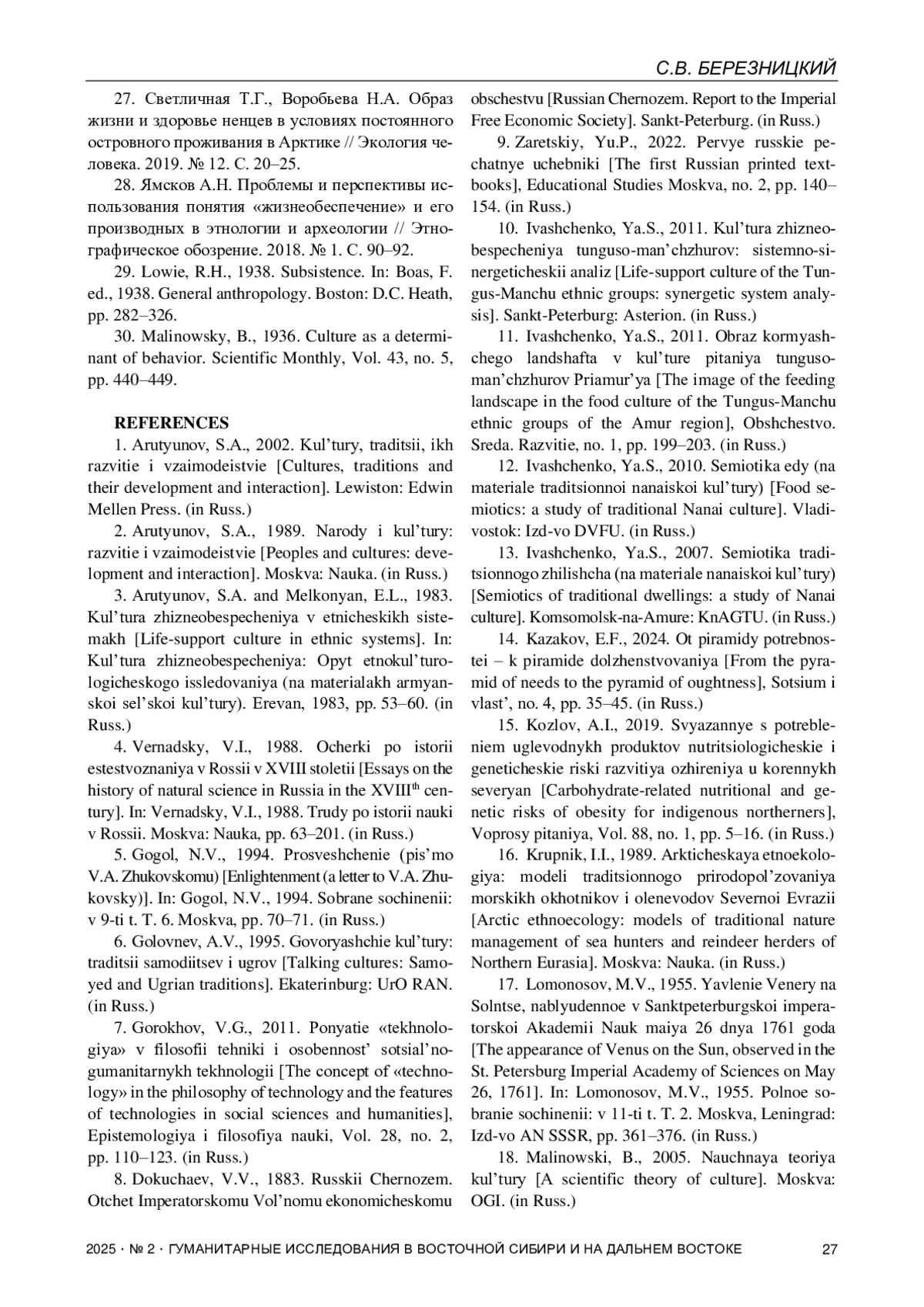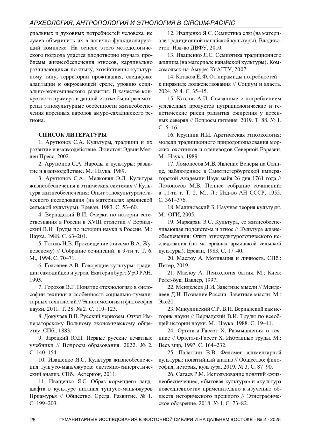 28. Ямсков А.Н. Проблемы и перспективы использования понятия “жизнеобеспечение” и его производных в этнологии и археологии // Этнографическое обозрение. 2018. № 1. С. 90-92.