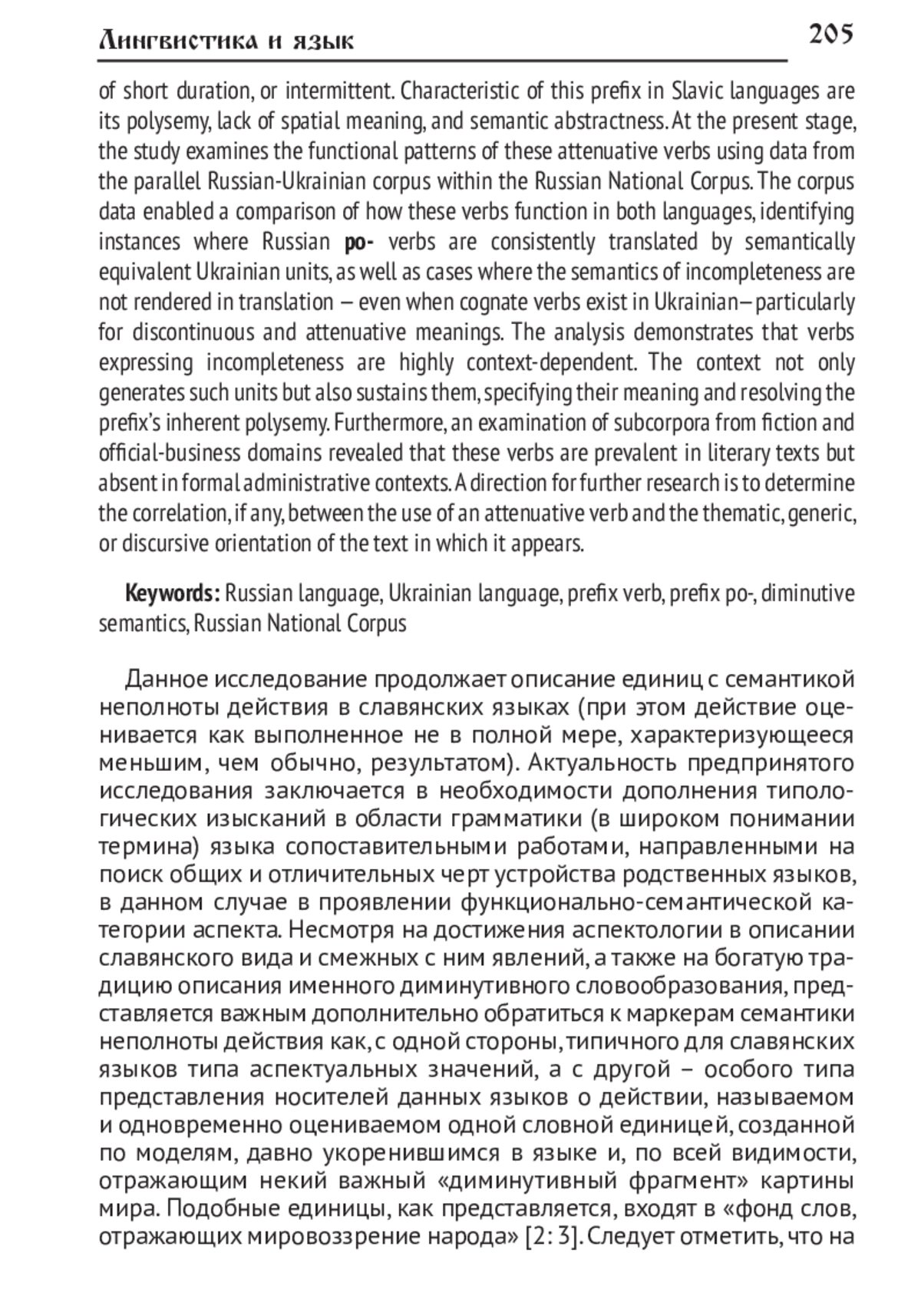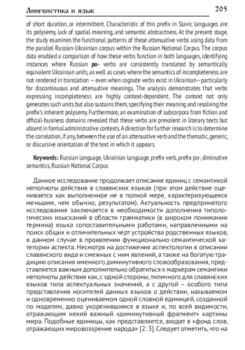 Статья посвящена исследованию одного из типов аспектуального значения, выполнена на материале украинских и русских глаголов с приставкой по-, выражающих неполноту действия и входящих в круг слов, отражающих мировосприятие носителей славянских языков. В качестве основополагающих использованы теоретические положения славянской аспектологии, функционального словообразования, префиксологии, исследований по описанию языковой картины мира. На предыдущих этапах исследования были выявлены как общие структурно-семантические черты рассматриваемых глаголов в русском и украинском языках, так и их различия, касающиеся частных значений «смягчительных» единиц, продуктивности префиксальных моделей формирования соответствующих значений. В качестве объекта анализа выступают глаголы с приставкой по-, которая, наряду с приставками під-/ под-, при-, над-, недо-, считается продуктивным маркером семантики неполноты, интерпретирующим действие как выполненное не полностью, в течение незначительного времени, с перерывами. Особенностями данного префикса в славянских языках является его многозначность, отсутствие пространственного значения и отвлечённость семантики. На данном этапе предпринято исследование функционирования глаголов со смягчительной семантикой на материале параллельного русскоукраинского корпуса Национального корпуса русского языка. Обращение к корпусу позволило сопоставить данные по функционированию «смягчительных» глаголов в русском и украинском языках, выявить последовательную передачу русских глаголов с приставкой по- на украинский язык семантически эквивалентными единицами, случаи отступления от передачи семантики неполноты (даже при наличии аналогичных глаголов в украинском языке), особенно при прерывисто-смягчительном значении. Анализ продемонстрировал зависимость глаголов со значением неполноты от контекста, который одновременно порождает подобные единицы и поддерживает их, конкретизируя их значение, снимая полисемию префикса. Анализ данных подкорпуса художественной и официально-деловой сфер функционирования показал востребованность исследуемых глаголов в художественной сфере и отсутствие - в официально-деловой. Дальнейшее исследование должно определить наличие/отсутствие корреляции между «смягчительным» глаголом и тематической/жанровой/ дискурсивной направленностью текста, в котором он употребляется.