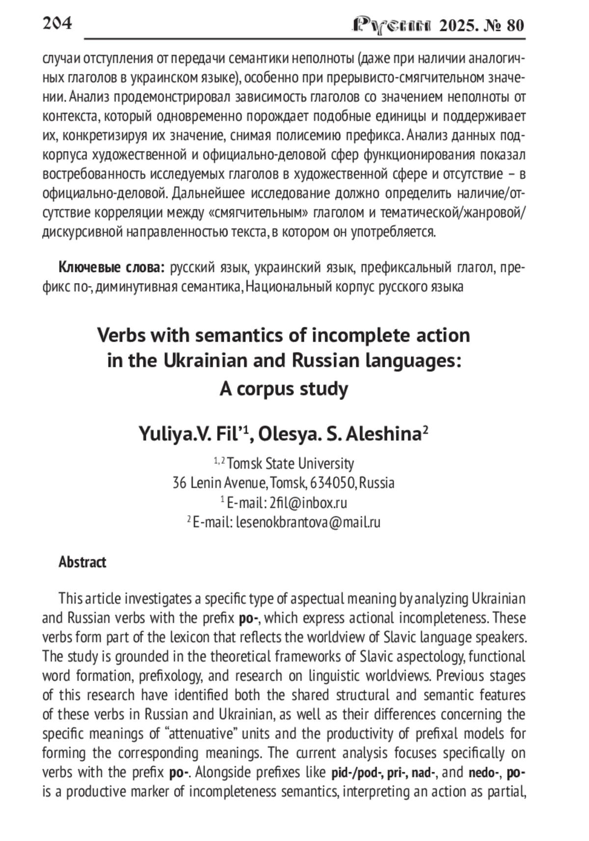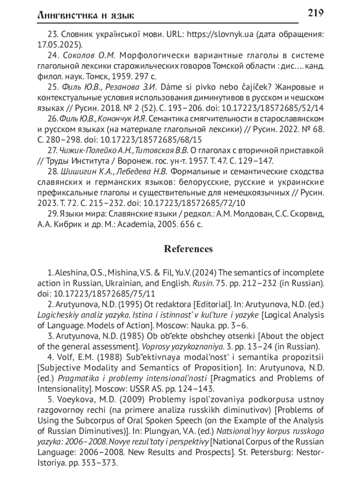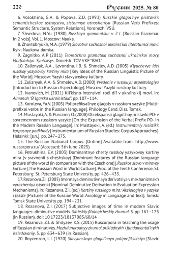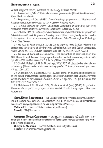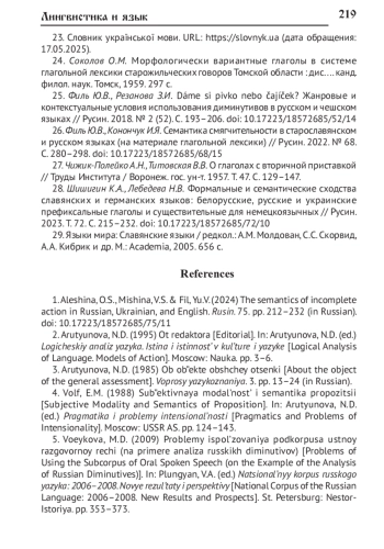 1. Алешина О.С., Мишина В.С., Филь Ю.В. Семантика неполноты действия в русском, украинском и английском языках // Русин. 2024. № 75. С. 212-232. DOI: 10.17223/18572685/75/11 EDN: GHBEOA