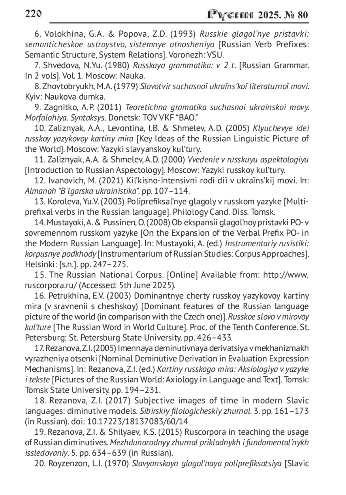 14. Мустайоки А, Пуссинен О. Об экспансии глагольной приставки ПО- в современном русском языке // Инструментарий русистики: корпусные подходы / общ. ред. А. Мустайоки [и др.]. Хельсинки, 2008. С. 247-275.
