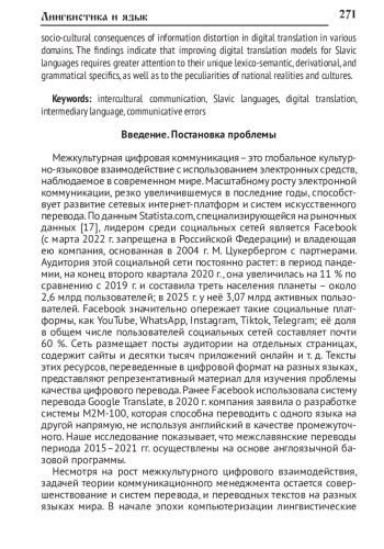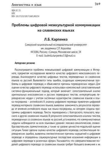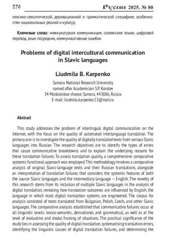 Рассматривается проблема межъязыковой цифровой коммуникации в Интернете, предметом исследования является качество цифрового межславянского перевода. Анализируется качество цифровых текстов, переведенных со славянских языков на русский. Выявляются типы ошибок, создающих коммуникативные проблемы в цифровом переводе, и объясняются причины переводческих неудач. Для оценки качества цифрового перевода использован комплексный сопоставительный системно-функциональный подход, который включает: сопоставительный анализ оригинальных инославянских и русских переводных текстов; интерпретацию переводческих неудач с учетом системных характеристик славянских языков и языка-посредника - английского. К анализу цифрового перевода привлечен цифровой перевод материала славянских языков, выявлена зависимость результатов перевода от влияния английского языка как языка-посредника, на котором созданы программы цифрового перевода. Тексты переводились с болгарского, польского, чешского и других славянских языков. В результате сопоставительного анализа текстов, переведенных со славянских языков на русский, установлено, что коммуникативные неудачи наблюдаются на всех языковых уровнях: лексико-семантическом, словообразовательном, грамматическом, а также на уровне ценностно-модальной оценки ситуации. Также сделана оценка качества цифрового перевода, систематизация переводческих ошибок, выявлены лингвистические причины нарушений в цифровом переводе и определены социокультурные последствия искажения информации в цифровом переводе в различных сферах. Указывается, что совершенствование моделей цифрового перевода со славянских языков требует большего внимания к их лексико-семантической, деривационной и грамматической специфике, особенностям национальных реалий и культур.