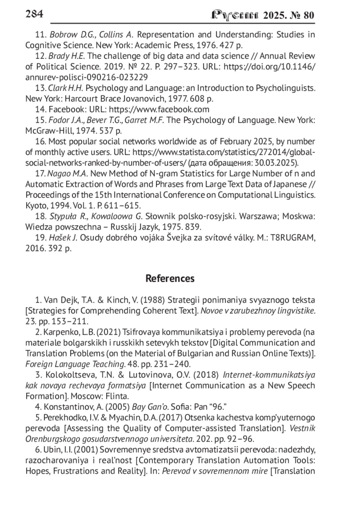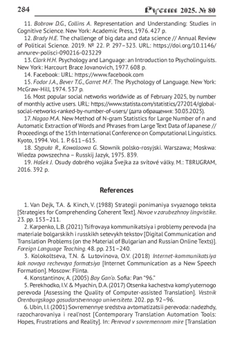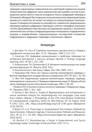 2. Карпенко Л.Б. Цифровая коммуникация и проблемы перевода (на материале болгарских и русских сетевых текстов // Foreign Language teaching. 2021. № 48. С. 231-240. EDN: YTQIFE